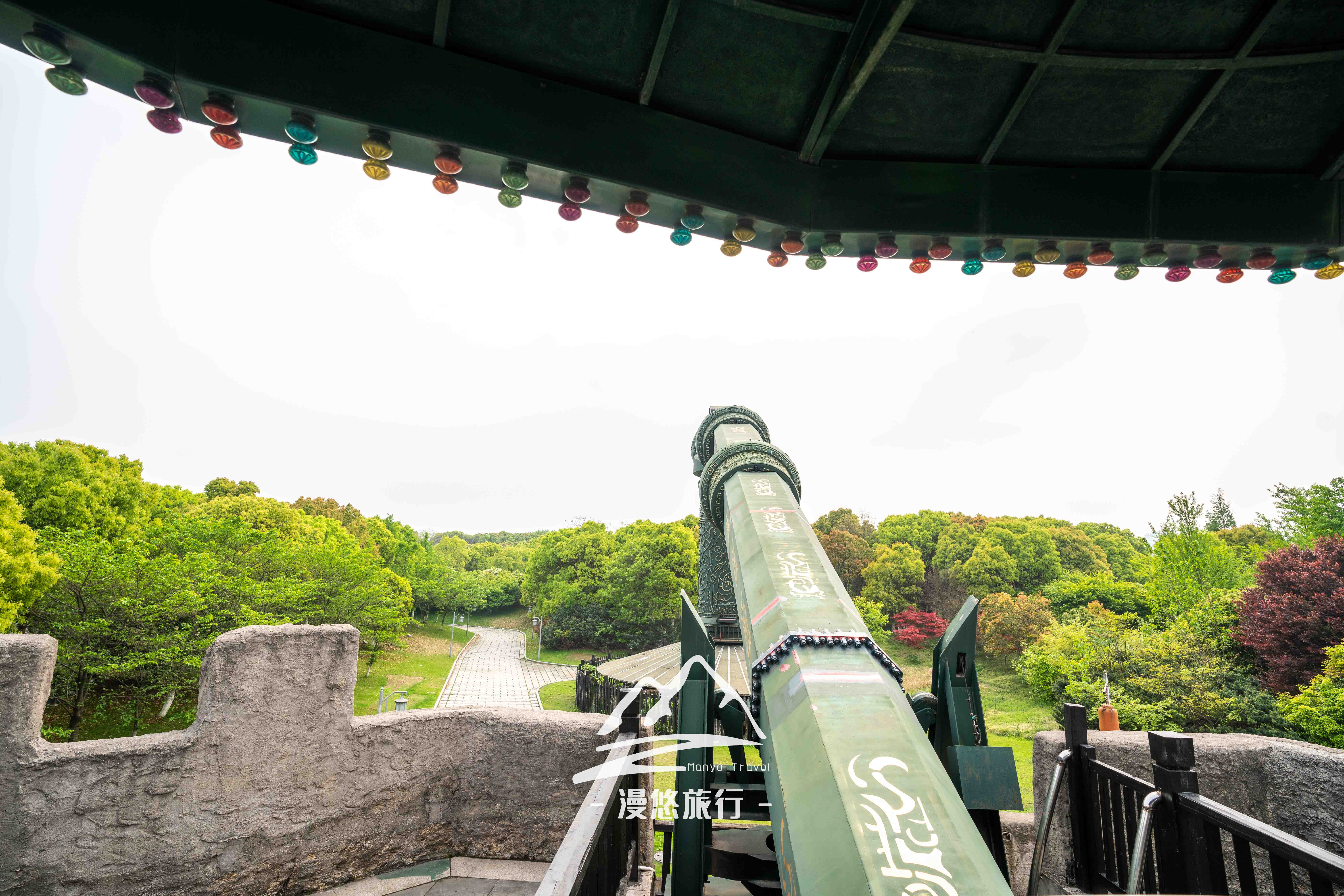 这是一个像是炮弹发射台的大家伙,站上去以后会缓慢上升,然后停留在一定高度360度旋转,整个淹城文化景区的风光像画卷一样徐徐展开,淹城遗址“三道城河、三道城墙”的形制在这里完美呈现出来。提醒一下,上面风很大,最好随身携带一个披肩,以免吹感冒。