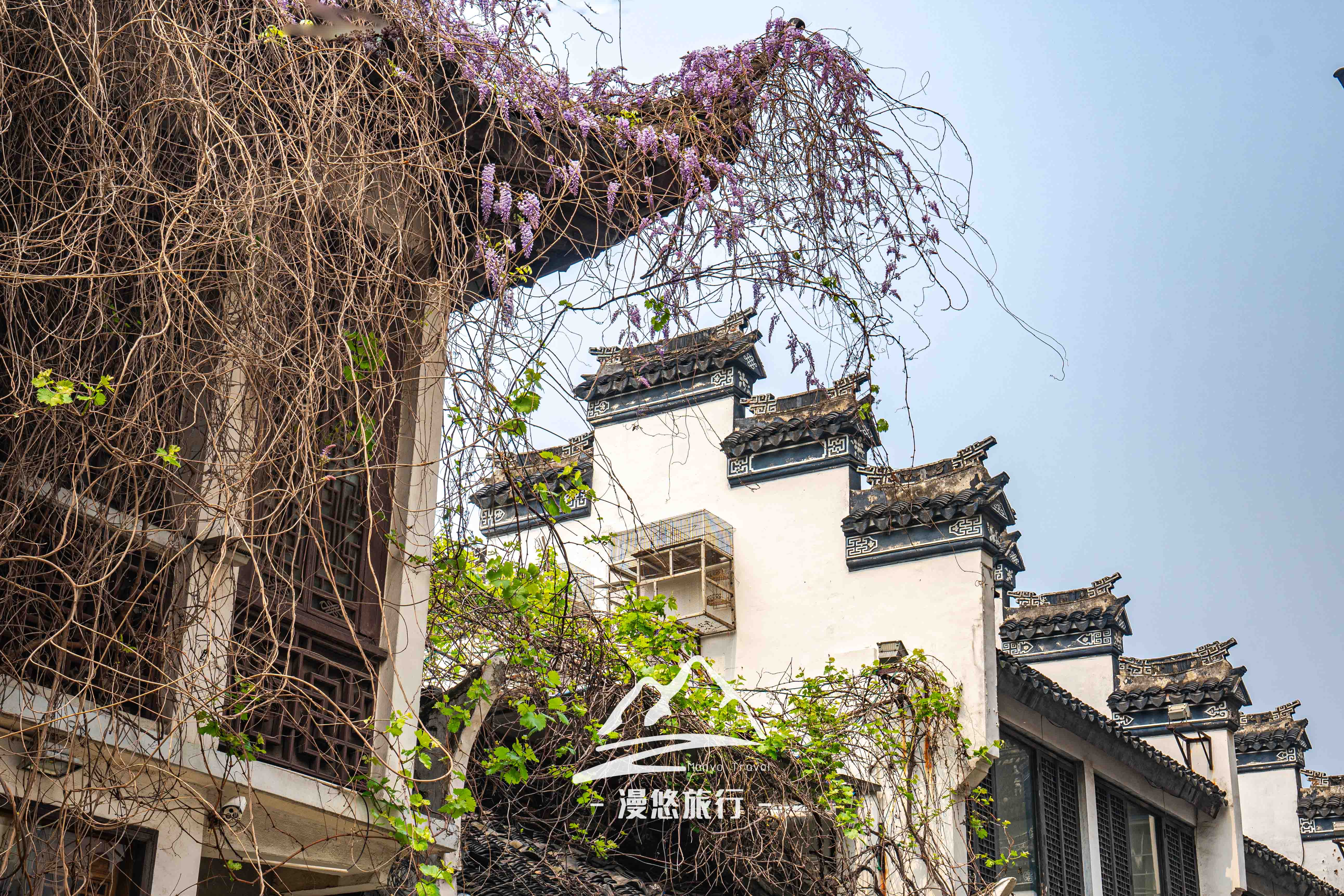 这是一幢非常精美的阁楼,青瓦白墙依次排开,最让人赏心悦目的是,楼顶有一株紫藤树,这个季节紫藤花开得正旺盛,紫色的花束就这样随性的垂挂在屋檐,青瓦白墙再搭配上这高贵的紫色,甚是迷人。当日,还有一位老先生在树底下描绘着近水阁风景,这画面太美了,征得老先生同意后,果断拍下了这美好的画面。