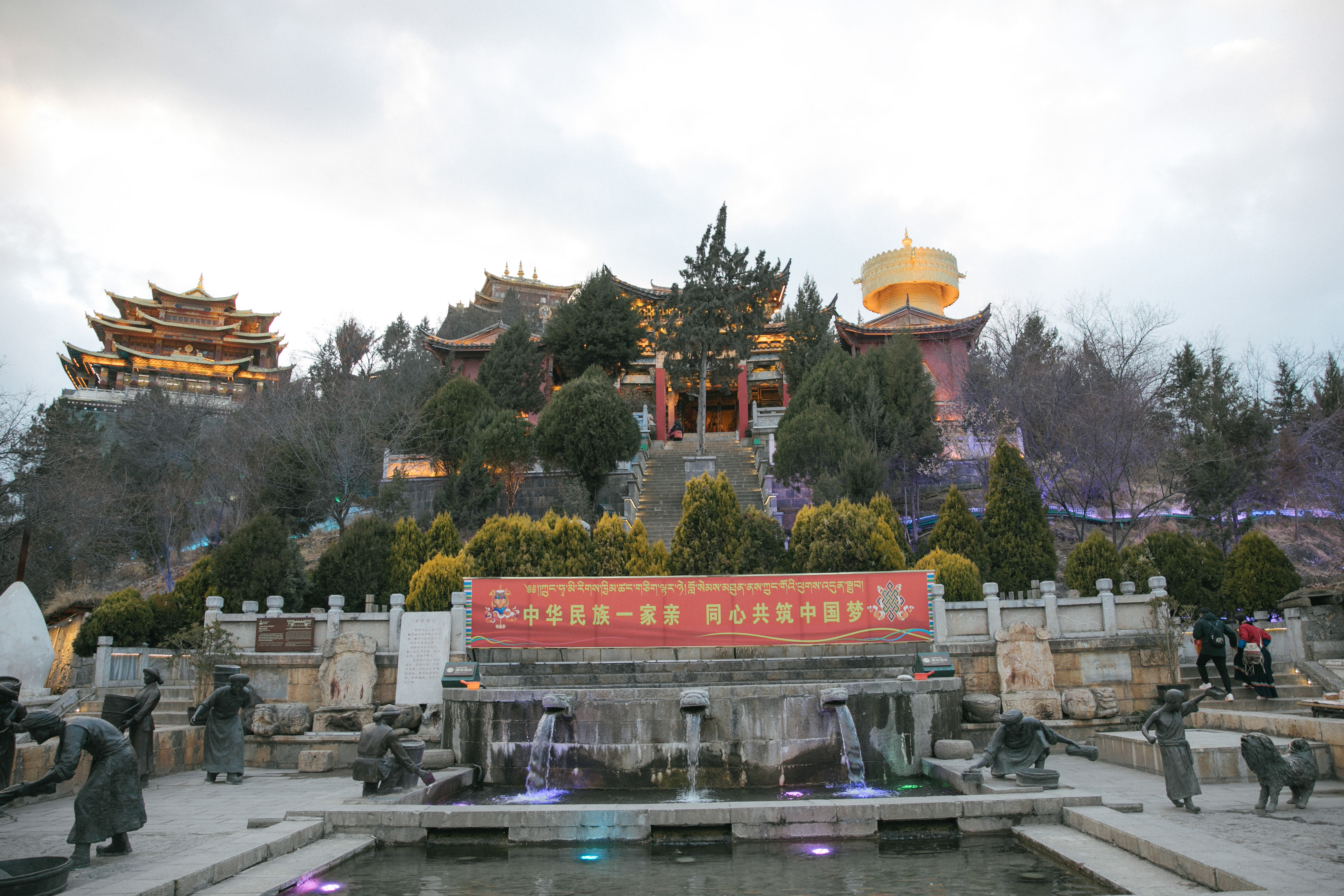 静谧的月光古城隐去了许多重建的痕迹,抬头可以看到世界最大的转经筒,在傍晚云霞中闪烁着金光,双手合十的虔诚信徒已经绕着它转了三圈。