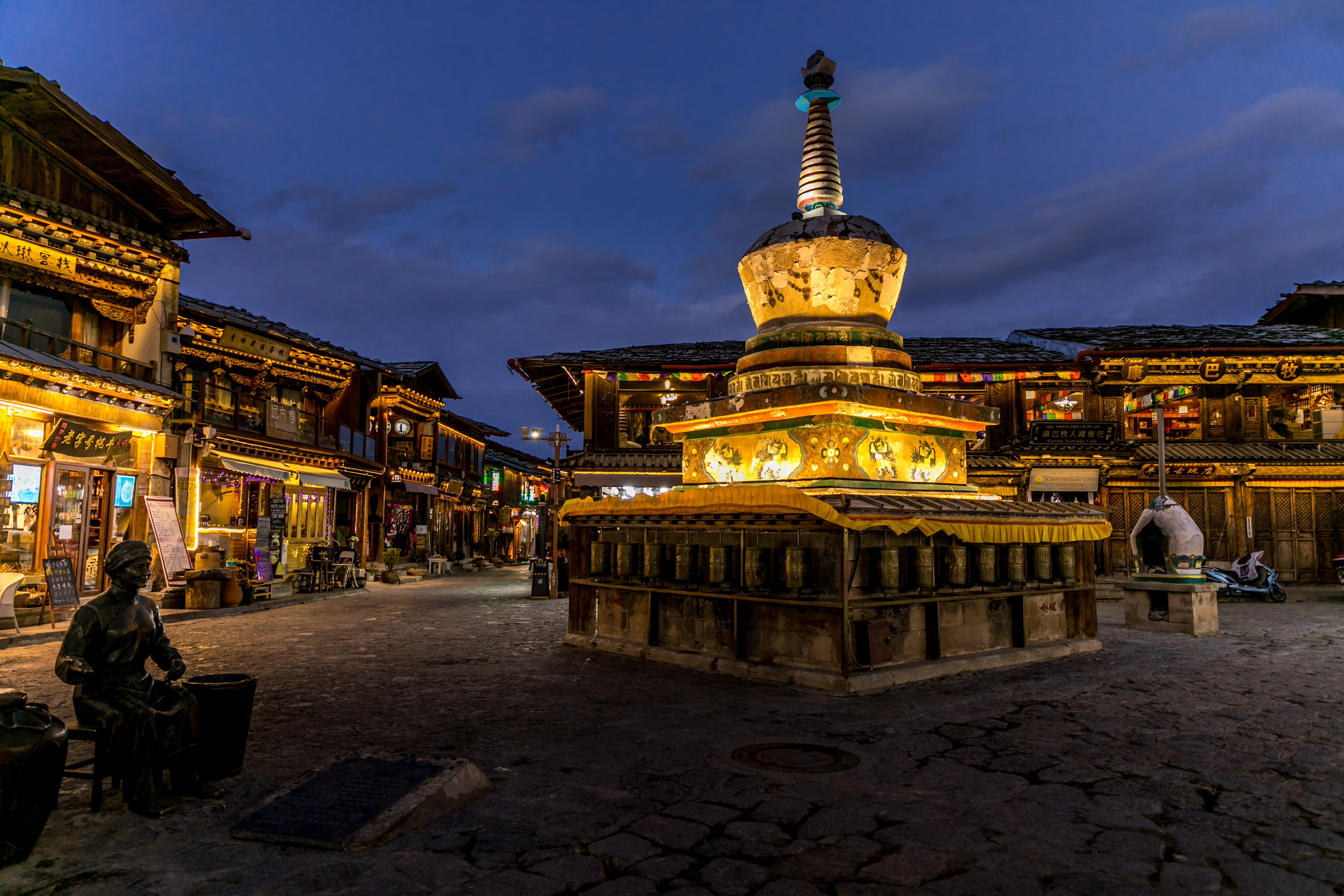 这里与丽江、大理古城的温柔细腻不同,处处显示出藏族特有的粗犷和坚韧,加上蓝天白云下飘扬着的经幡和一座座佛塔,显示着浓浓的宗教气息。