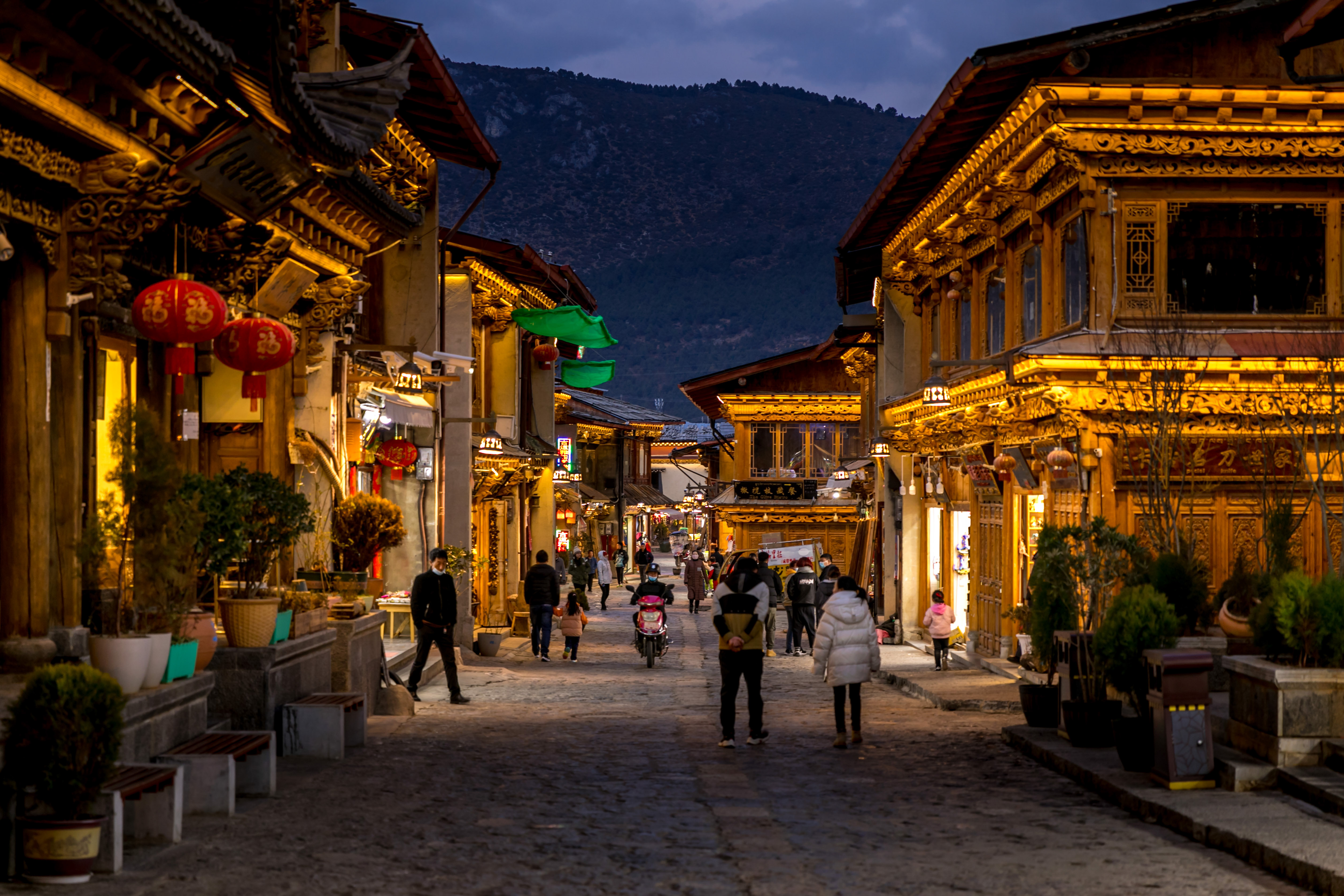 小巷深处中,林立的店铺面前喧嚣尚未散尽,月色与灯光相柔和,颇有种灯火阑珊处的朦胧美。