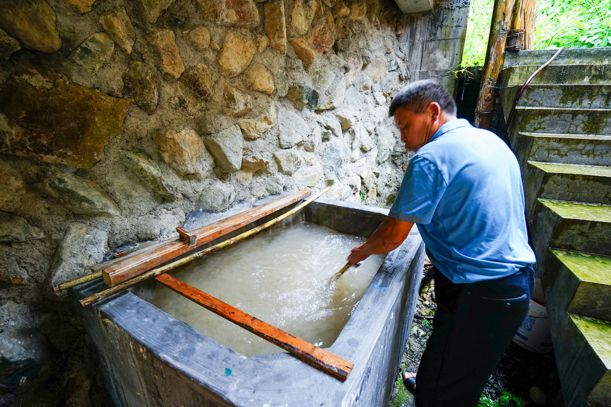 用当地山桠皮,取皮晒干,浸泡三两月再敲打,经加石灰腌、反复碓细、大锅蒸熟,再进行一系列“霉烂”、榨干、碓细、漂洗等工艺,混入“捞纸药”(用野生猕猴桃藤浸出来的胶水),才能成为制纸备用的“纸浆”。