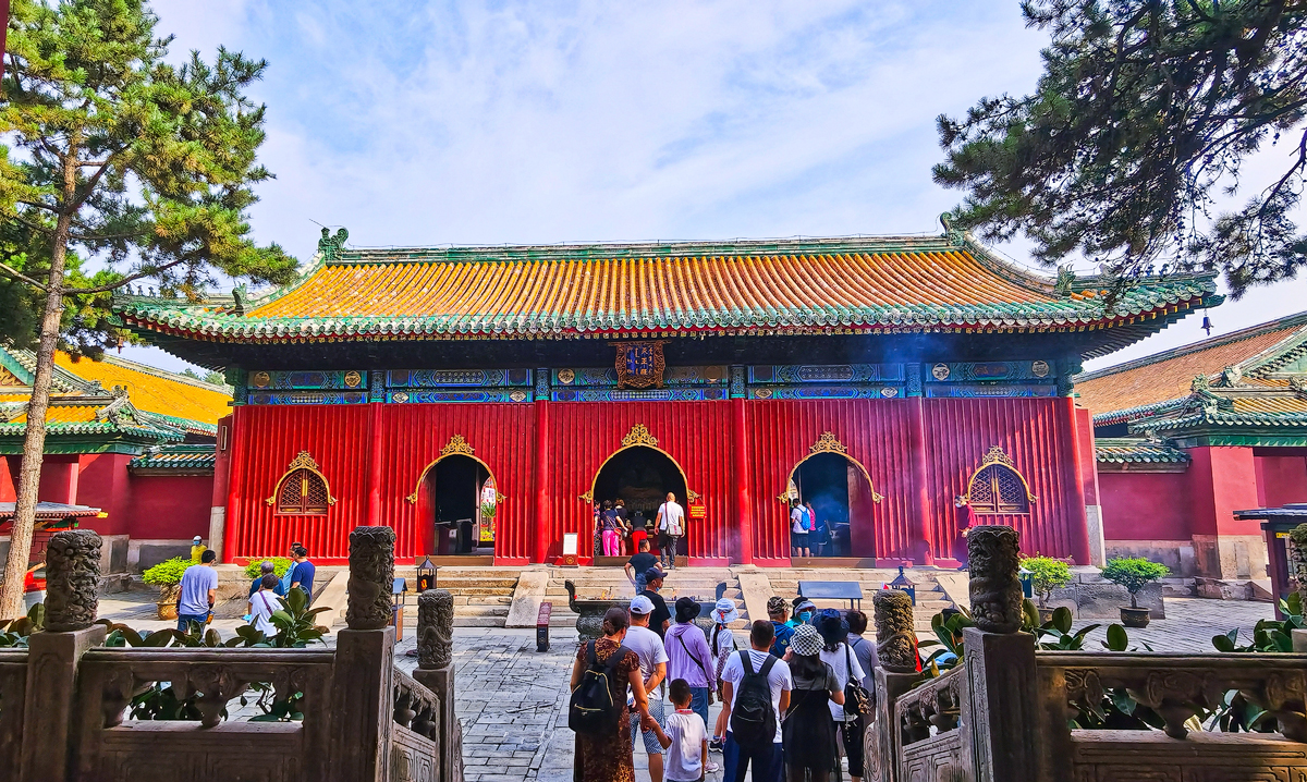 游客们观赏着殿顶上覆盖的镏金铜瓦,与台壁的红绿两色相映,显得格外雄伟壮观。 这里的殿宇依山就势,布局自然,基本是藏传佛教的建筑模式。大家都在此开心留影。