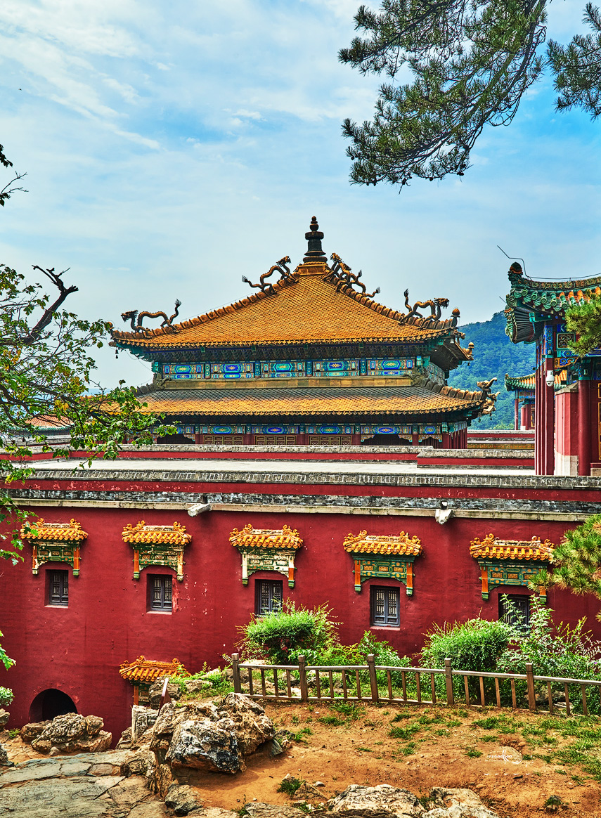 宫墙雄踞山庄最高处,这里可鸟瞰宫墙随山势而蜿蜒起伏,也可以远眺一组组红白相间的庙宇建筑,层层叠叠。这边是“小布达拉宫”普陀宗乘之庙。那边是“外八庙”中的须弥福寿之庙,它们同样掩映在绿荫之中。