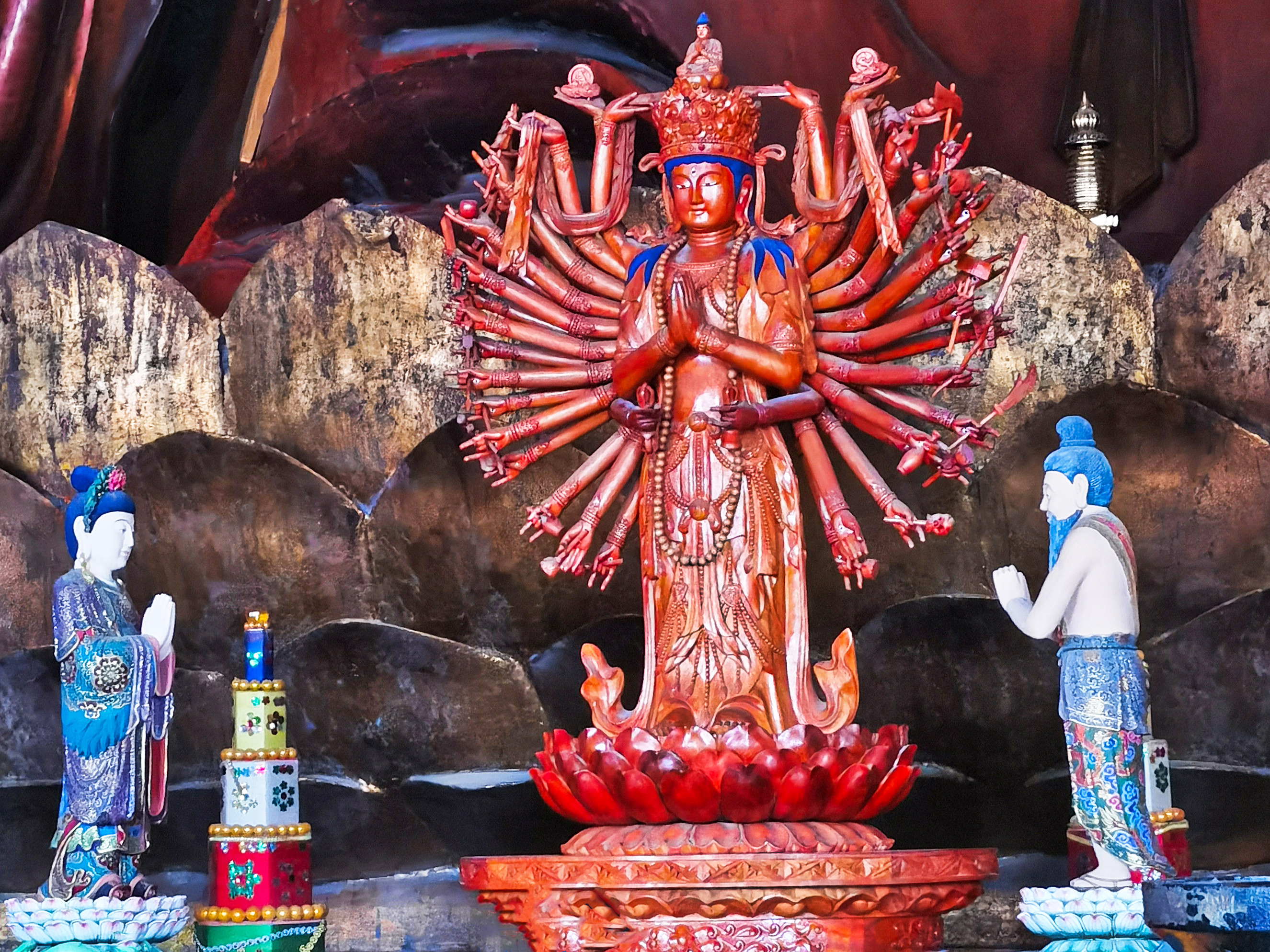 大乘阁内的千手千眼观音立像,金漆木雕,佛像头戴宝冠,身披璎珞,凝神庄严。衣纹潇洒流畅,雕饰细腻,是 中国 乃全世界佛教艺术史上罕见的杰作。观音立像高22.3米,42条手臂除中间两手合掌外,左右各有20只手,手中各有一眼。每只手每只眼各代表25种因果报应,25乘40等于1000,便是千手千眼。寓意观世音 菩萨 神通广大,有求必应。