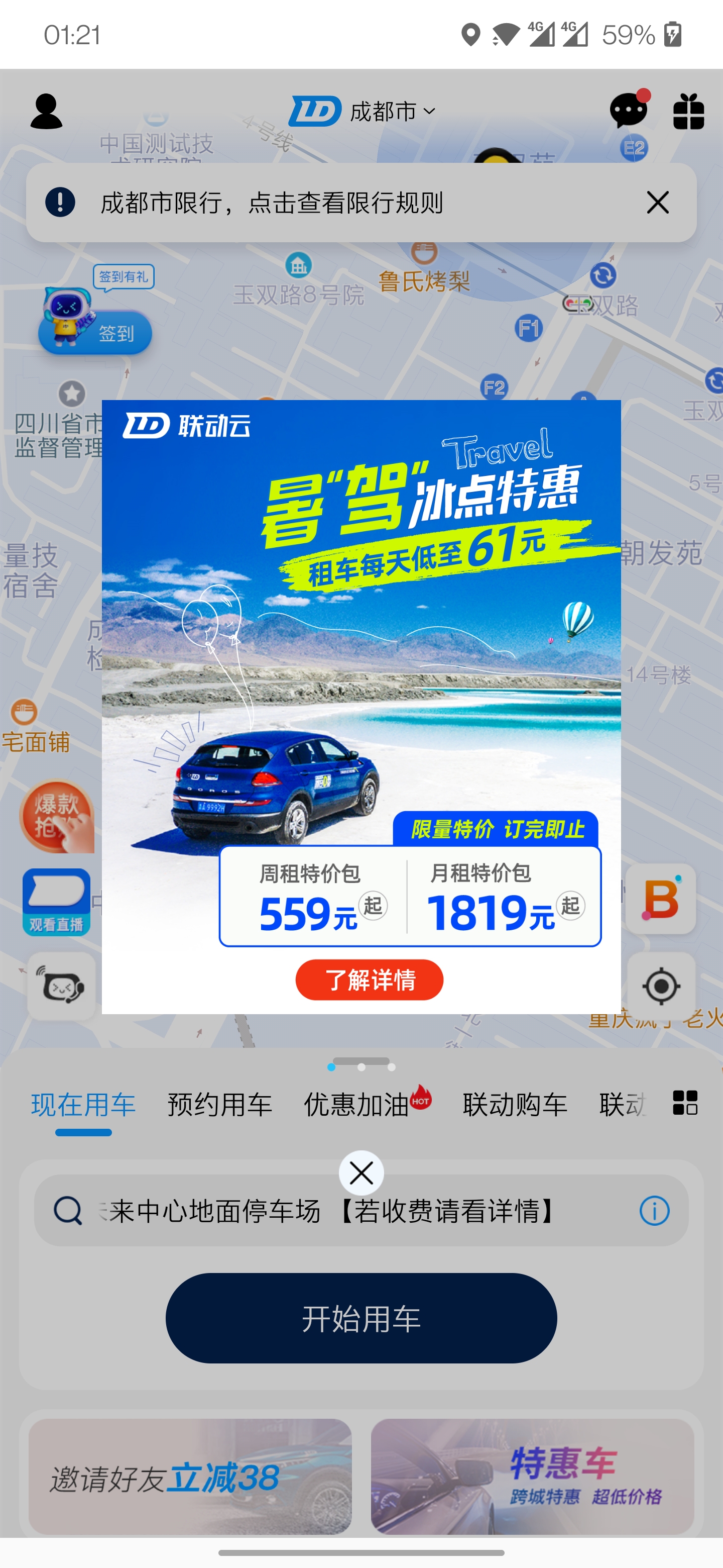 现在正值暑期,联动云推出了暑期租车活动,租2/3/5/7/30天,都有套餐优惠价,每天低至61元,这次我租了3天。