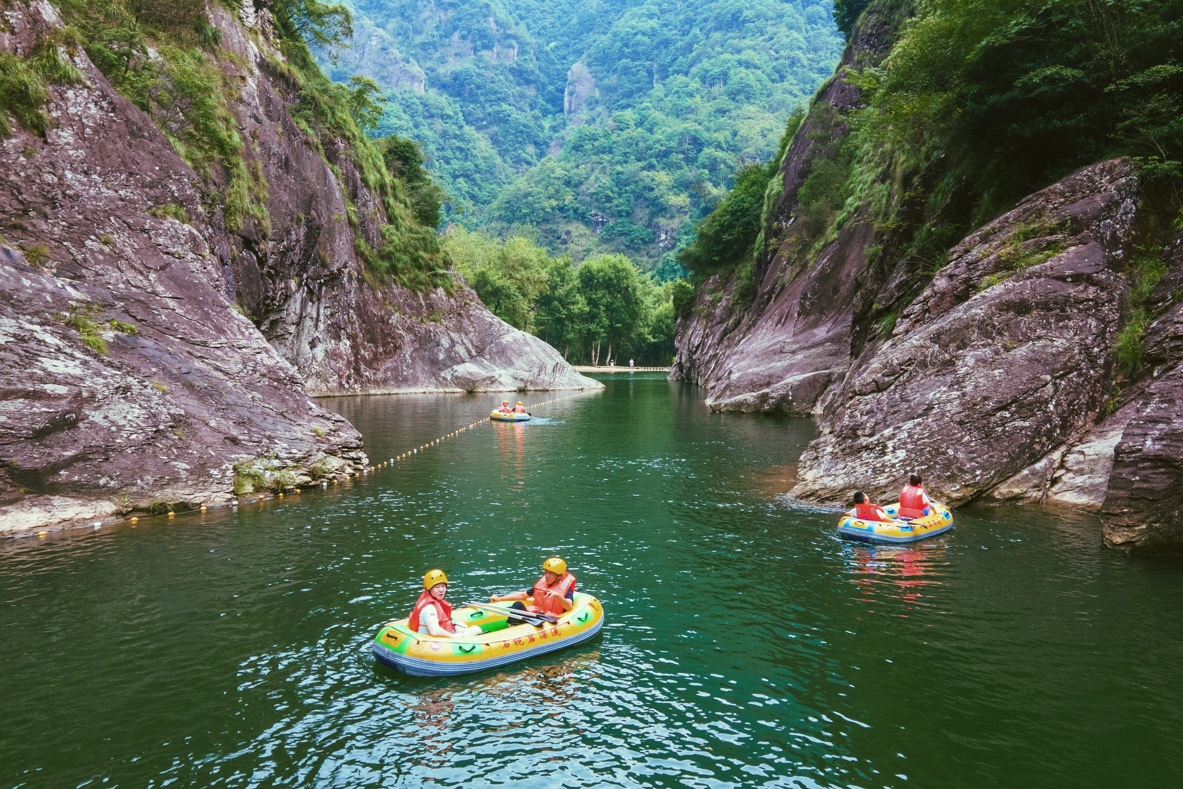 漂流途中可见小三峡,长约3公里,峡谷蜿蜒盘亘、潭水幽深,两岸山峰更是青翠动人,是石桅岩的精华所在。