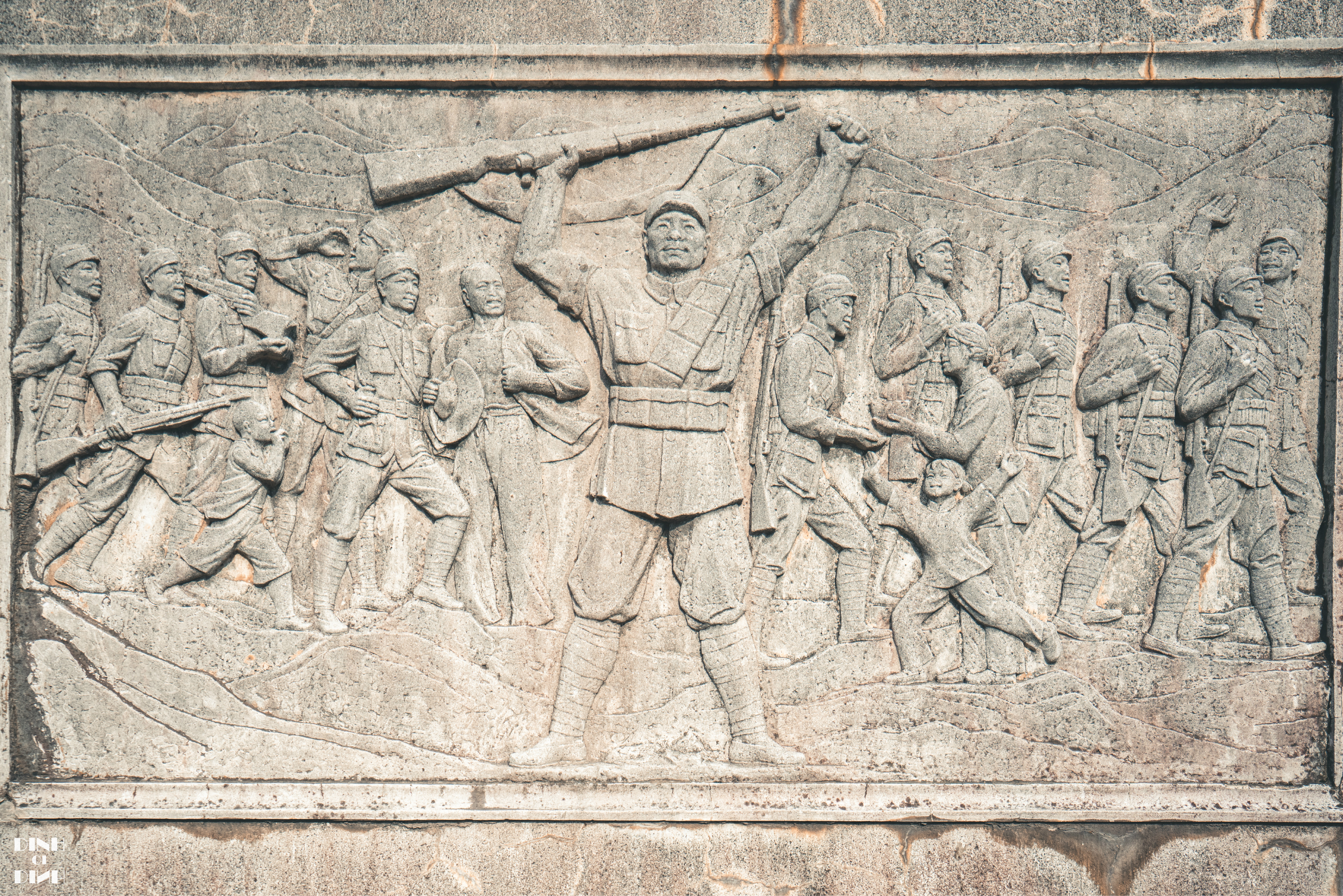 碑座上端的红旗,表现了陈毅名句“故国旌旗到江南”的意境。韦岗战斗遗址陈列室,以详实的图片资料,生动地再现了新四军挺进苏南,首战告捷的场面。