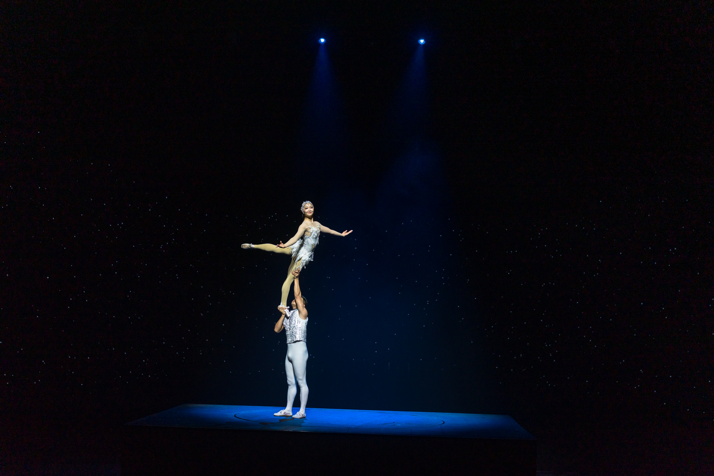 还有我最喜欢的保留节目,光线星辰中的杂技秀。如卷轴般的星空投影笼罩舞台和观众,将舞者的优美身姿变成剪影,投射到每一位观众的眼里心中。光影之美和身体之美如此和谐统一的呈现在眼前。