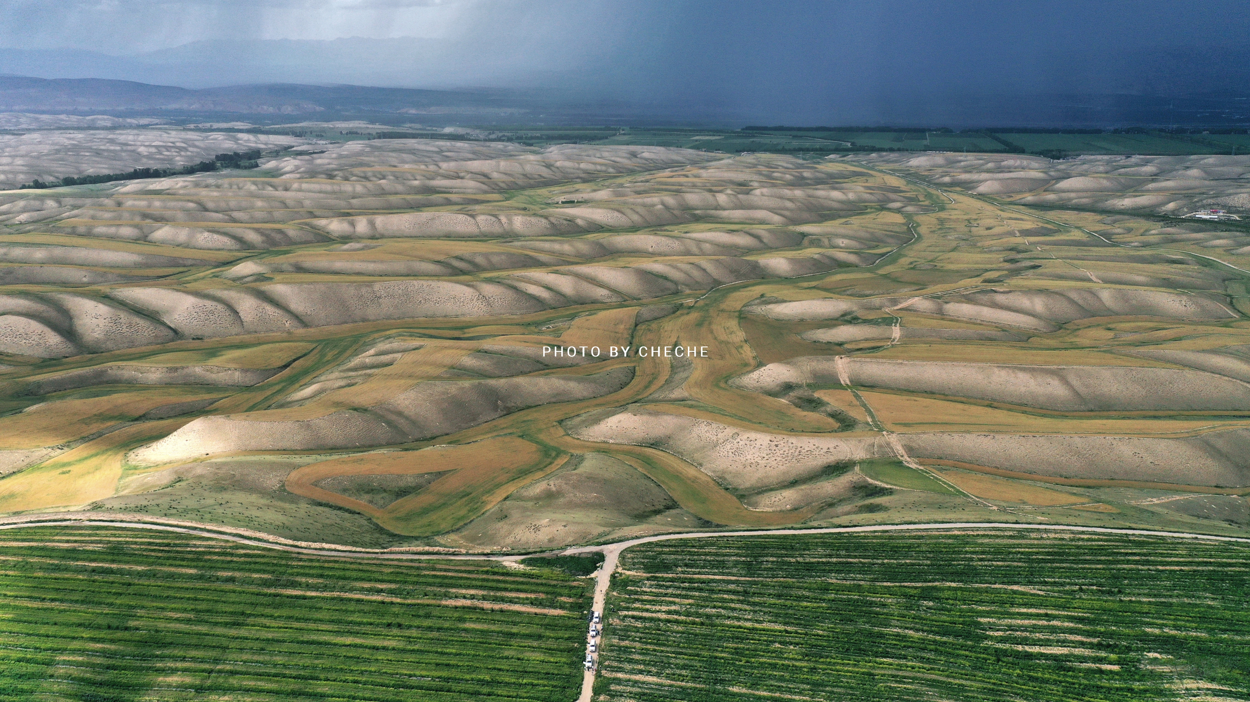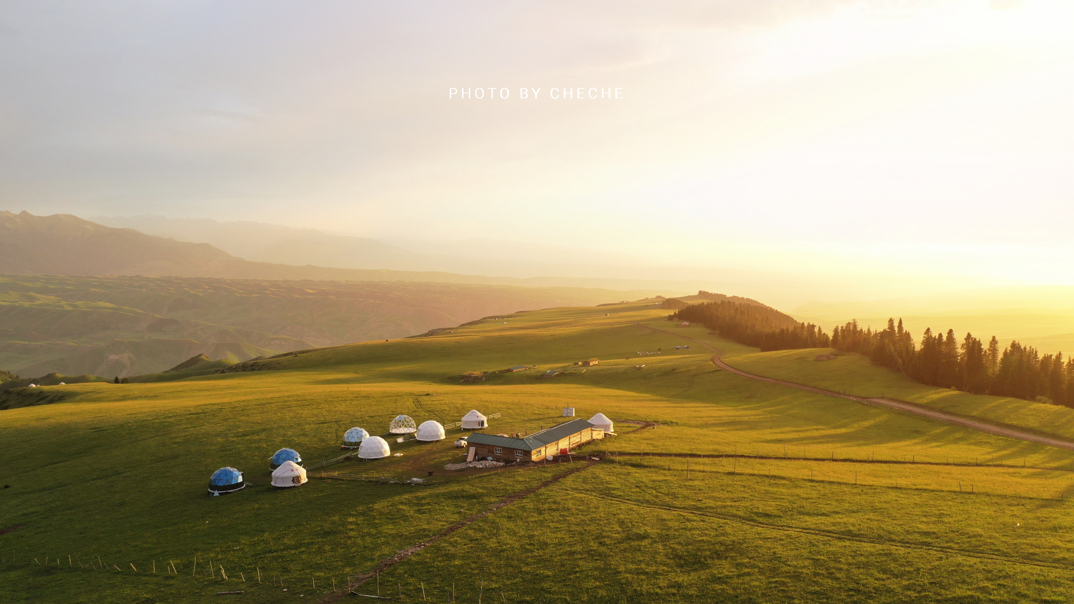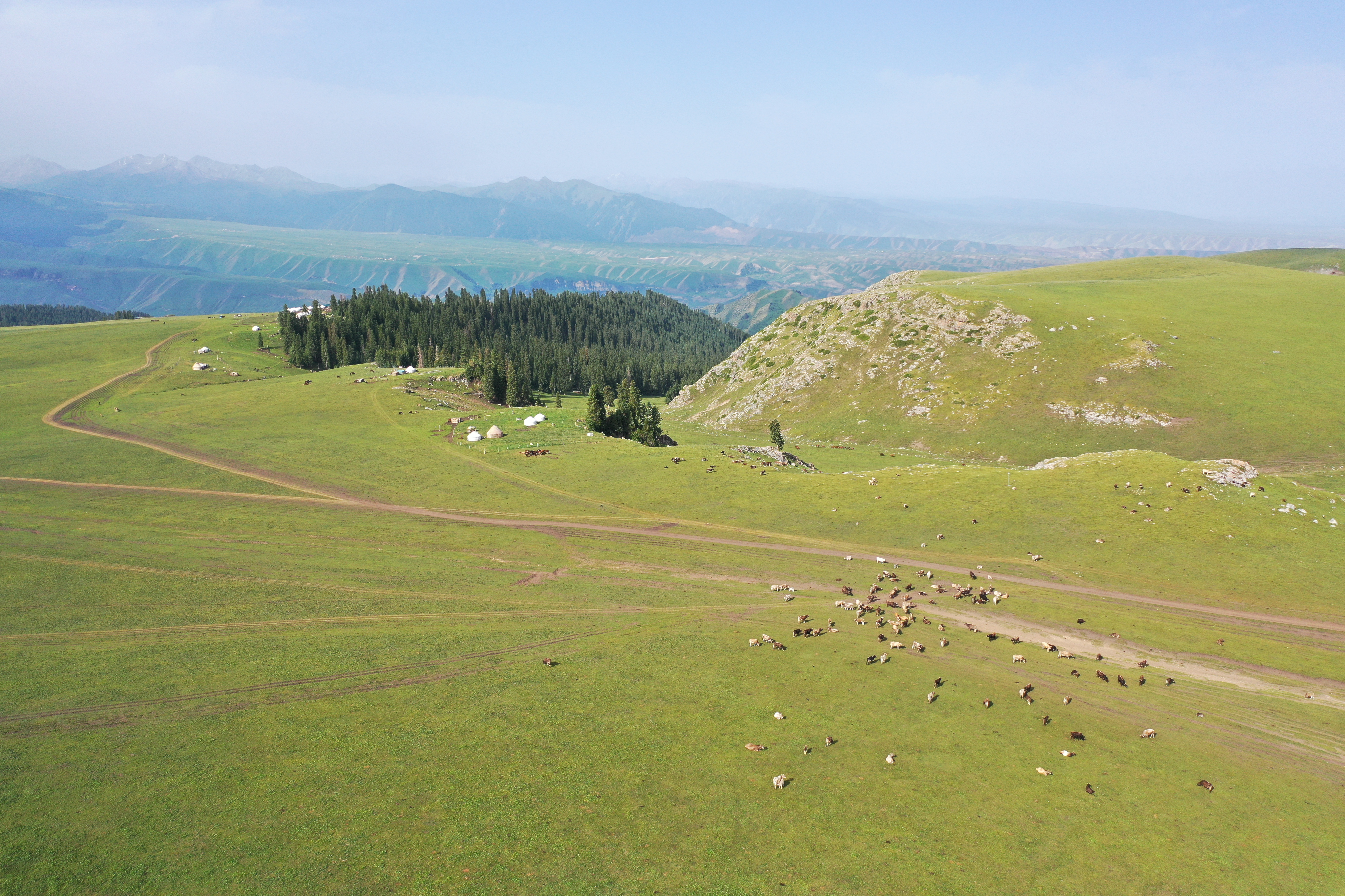 从特克斯出发,翻山过河。过了克什库什台村,一路都是连绵不断的空中草原。成群的牛羊在山坡上吃草,遍地的油菜花开放。