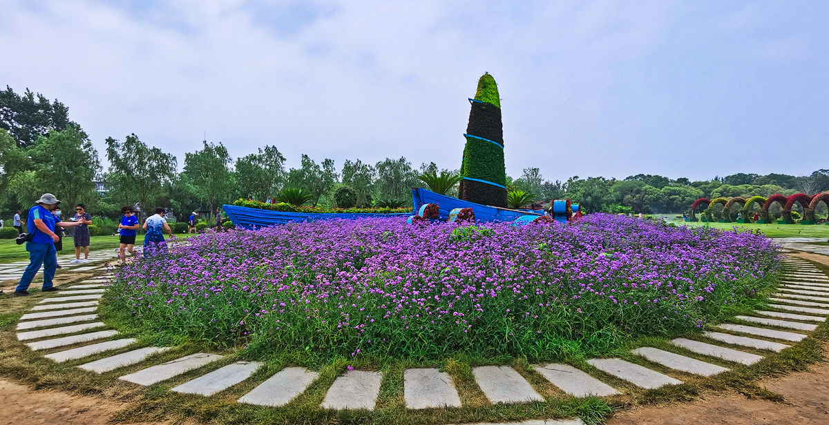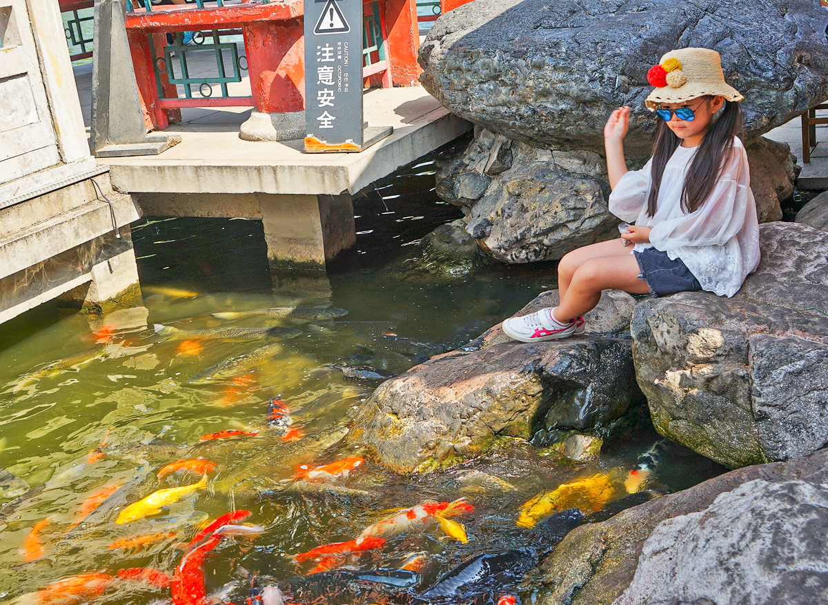 游客们在景区的公园里很开心,超大的锦鲤让喂鱼的孩子们更是玩得不亦乐乎!
