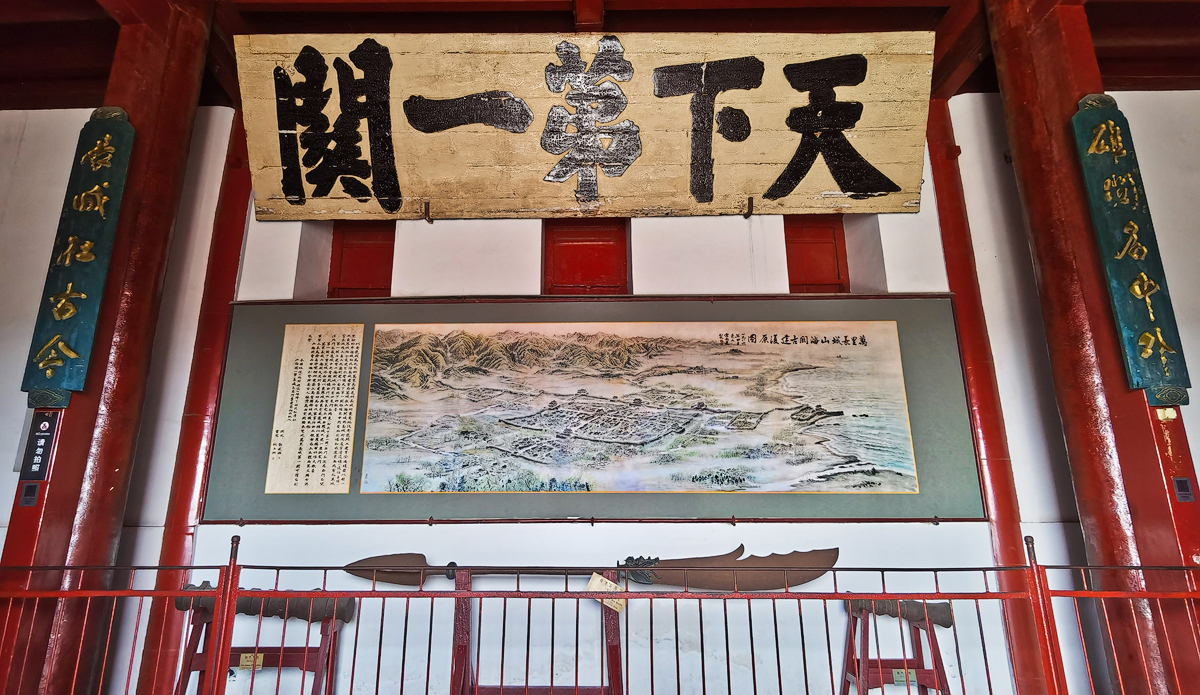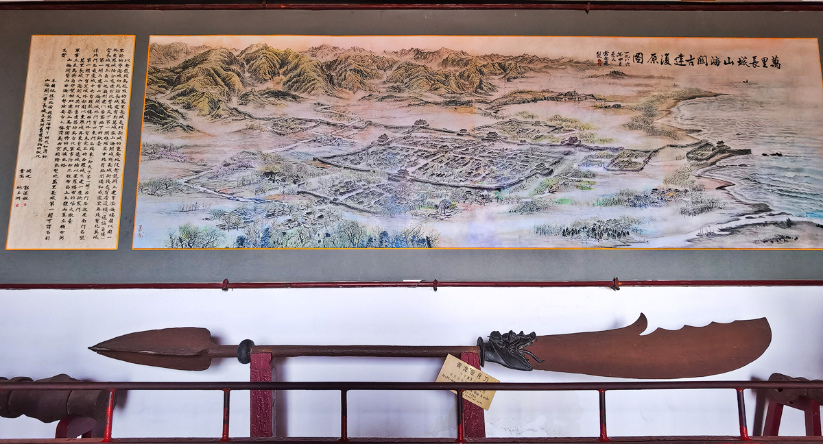 山海关 位于明长城东端,向北是辽西走廊西段,地势险要,为古碣石所在地,所以史家又称其为“碣石道”。关城北倚燕山,南连渤海,故得名 山海关 ,冀辽在此分界。 我们登上城关,参观了极为珍贵的“万里长城 山海关 古建筑原图 ”,还有关二爷的“青龙偃月刀 ”!
