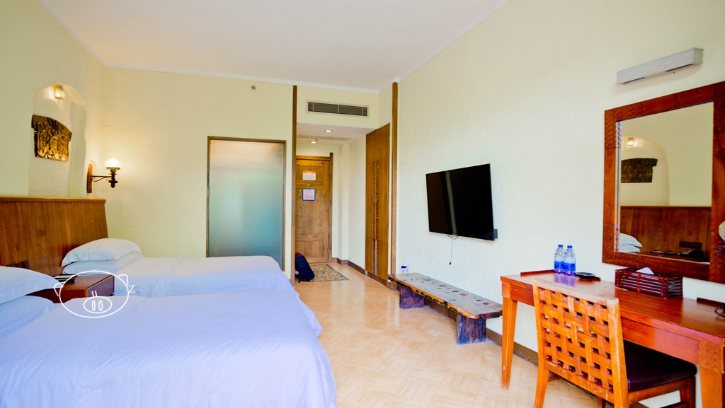 房间楼层通道铺地毯,标准双床房,简洁装饰,房间还算大,窗口边有两张靠背椅,配了办公桌实用,挂墙液晶电视,免费WI-FI,中央空调,卫生间干湿分离,配有淋浴间。