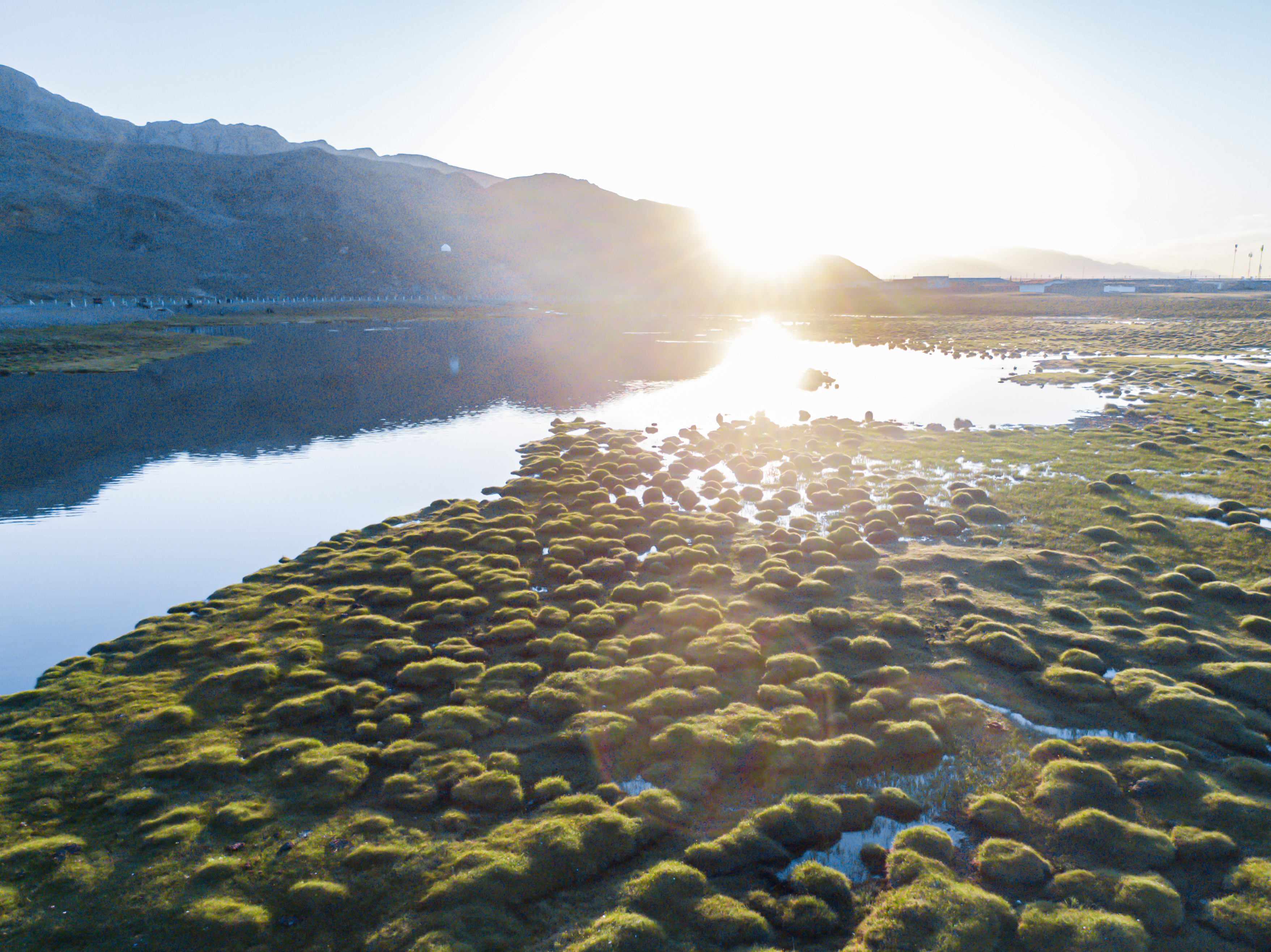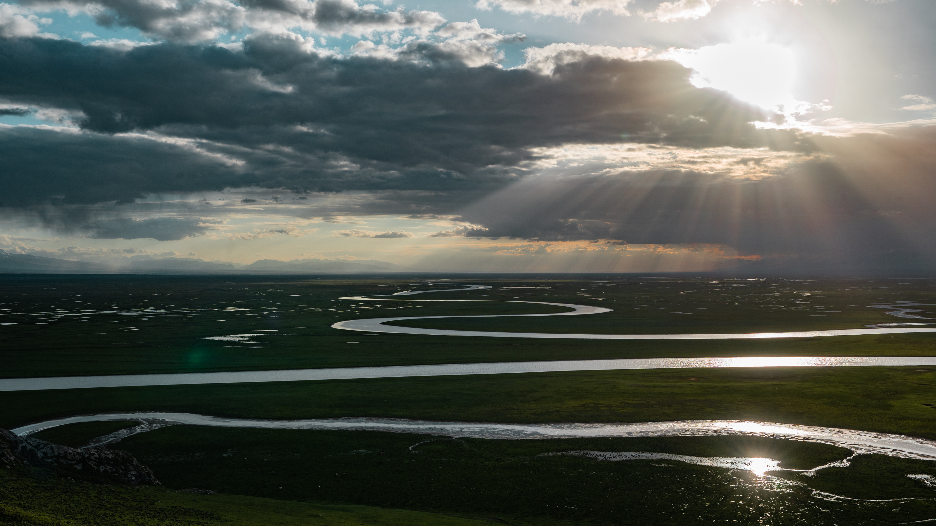 这片无名湿地并没有多少人知道,景色却极美。雪山一字排开,覆满绿色的土地被沟沟壑壑的湖水冲蚀成大小不一的形状。有些是一个个圆润的绿色石头,散落湖中;有些被曲折的水流勾勒成大片的陆地。日照金山的倒影映在水中。远处,成群的牛羊在雪山与倒影的缝隙间穿行。空中俯瞰,蜿蜒的溪流不比九曲十八弯弱,让人联想到地球脉动,地球之肺。