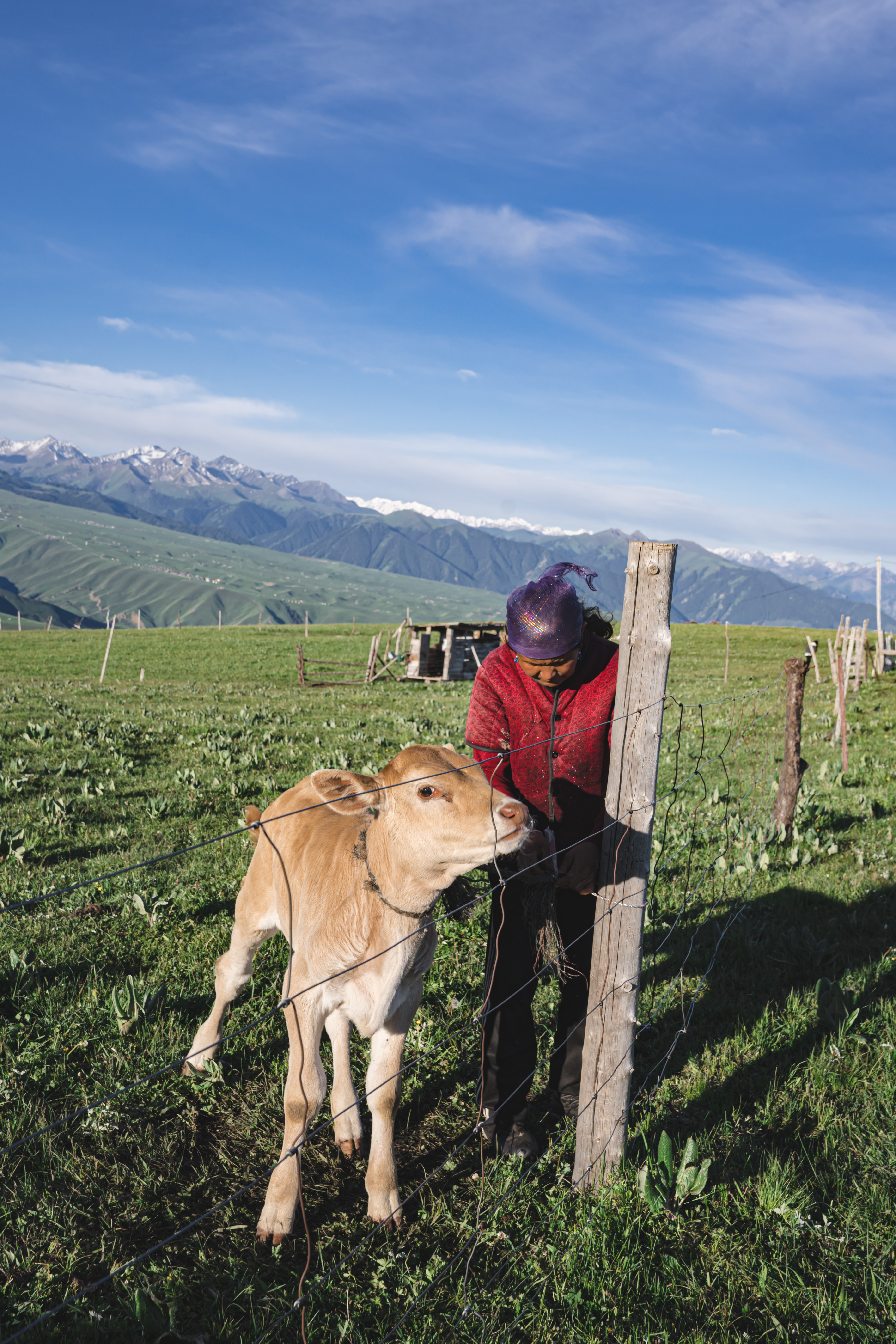 毡房修在青草葱茏的山坡上,与连绵的天山雪山隔着库尔代峡谷对望。每家每户都用木篱圈出自家草场,当西天的霞光染红了山头,牛马羊也会回到栅栏内,度过黑夜。