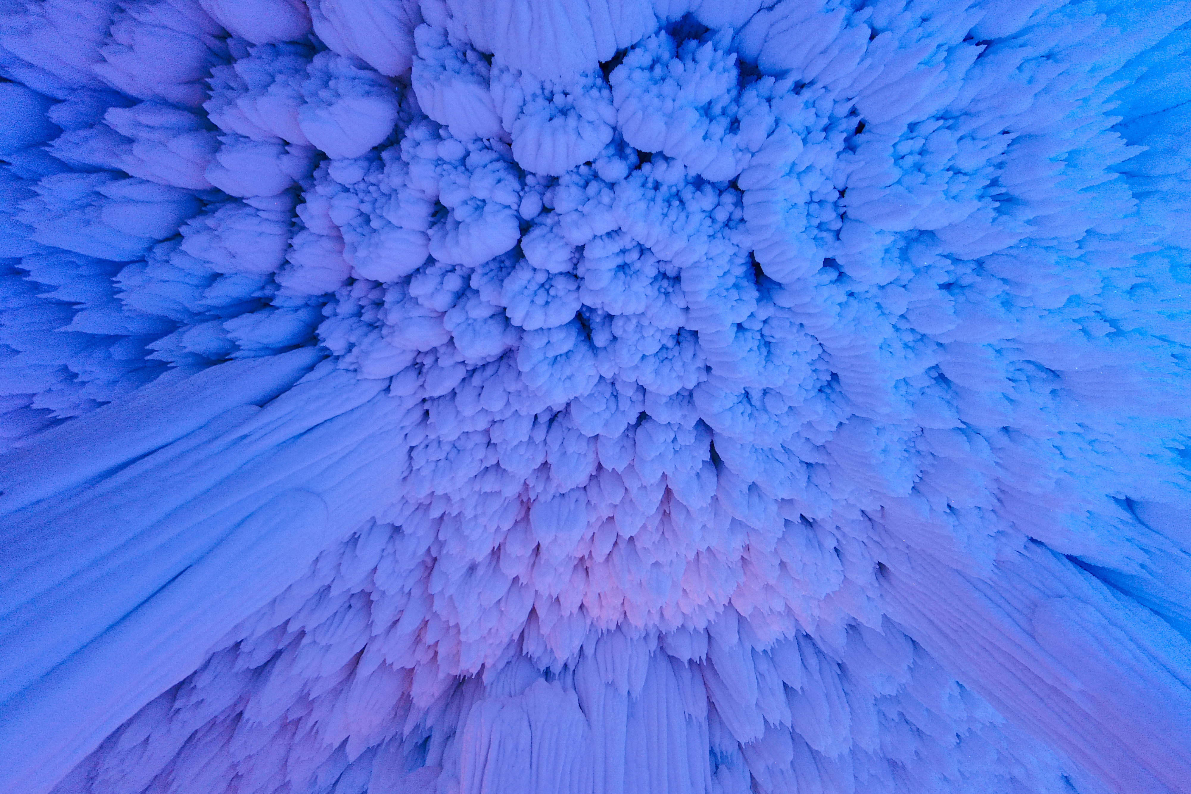 洞穴内,随处可见冰柱、冰笋、冰钟乳、冰石花、冰葡萄,还有神秘深邃的冰洞洞穴。洞穴内也有灯光变换,七彩阑珊,梦幻世界。