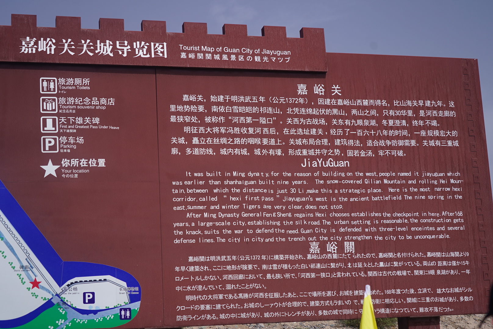 嘉峪关,号称“天下第一雄关”,位于甘肃省嘉峪关市西5千米处最狭窄的山谷中部,城关两侧的城墙横穿沙漠戈壁,北连黑山悬壁长城,南接天下第一墩,是明长城最西端的关口,历史上曾被称为河西咽喉,因地势险要,建筑雄伟,有连陲锁钥之称。嘉峪关是古代“丝绸之路”的交通要塞,中国长城三大奇观之一
