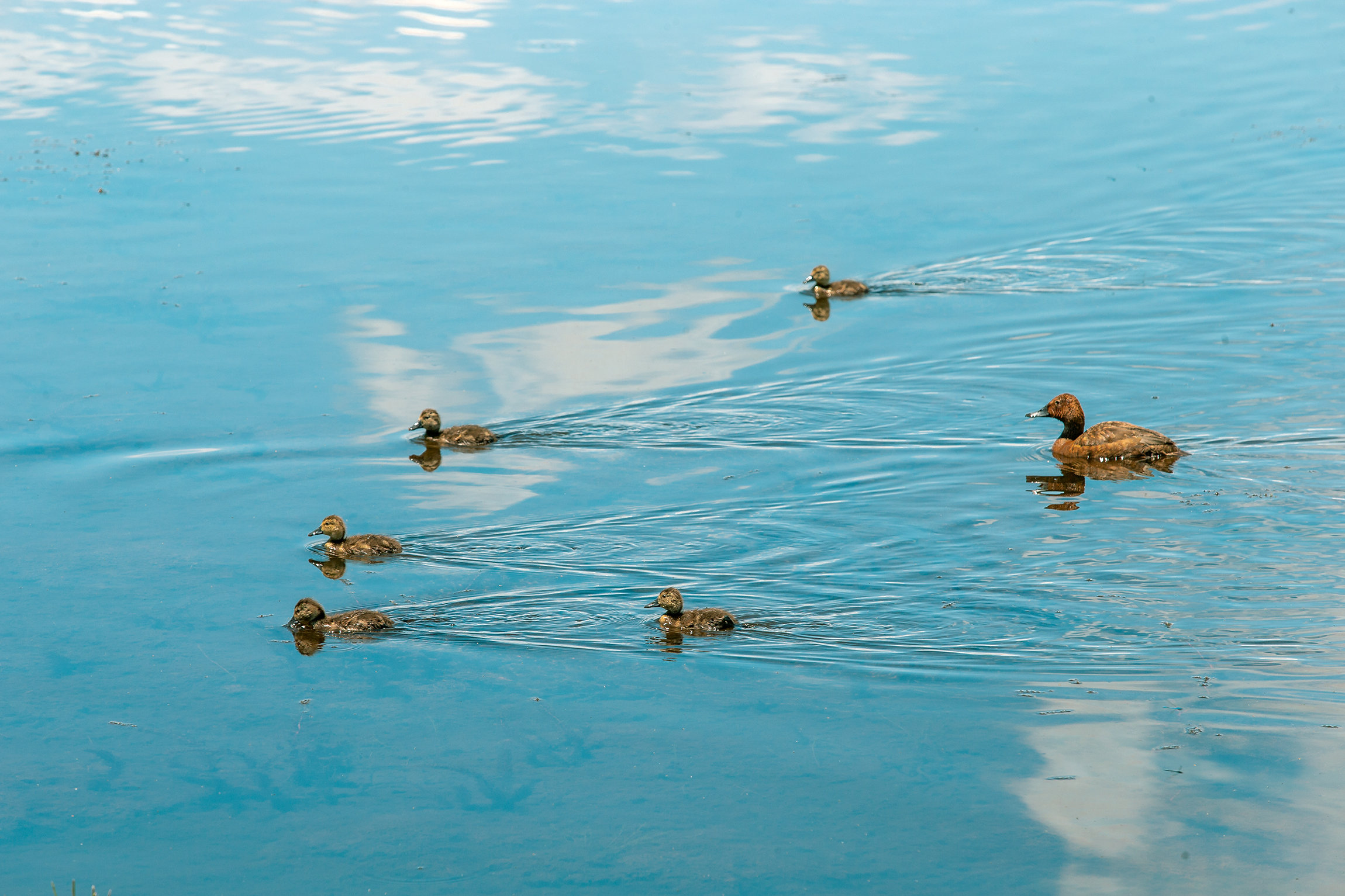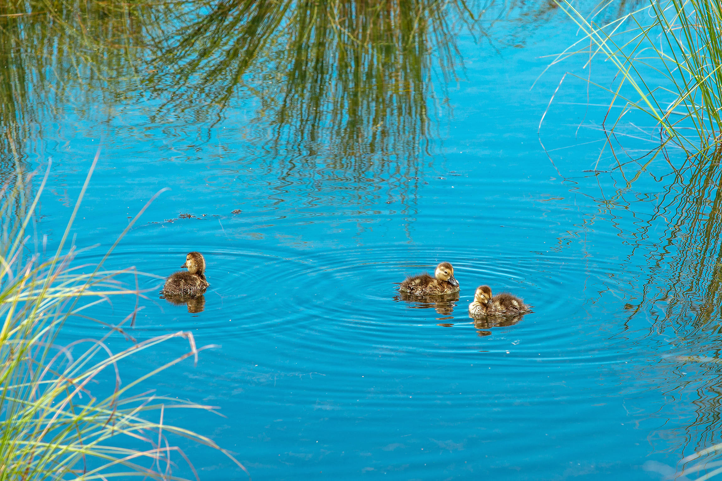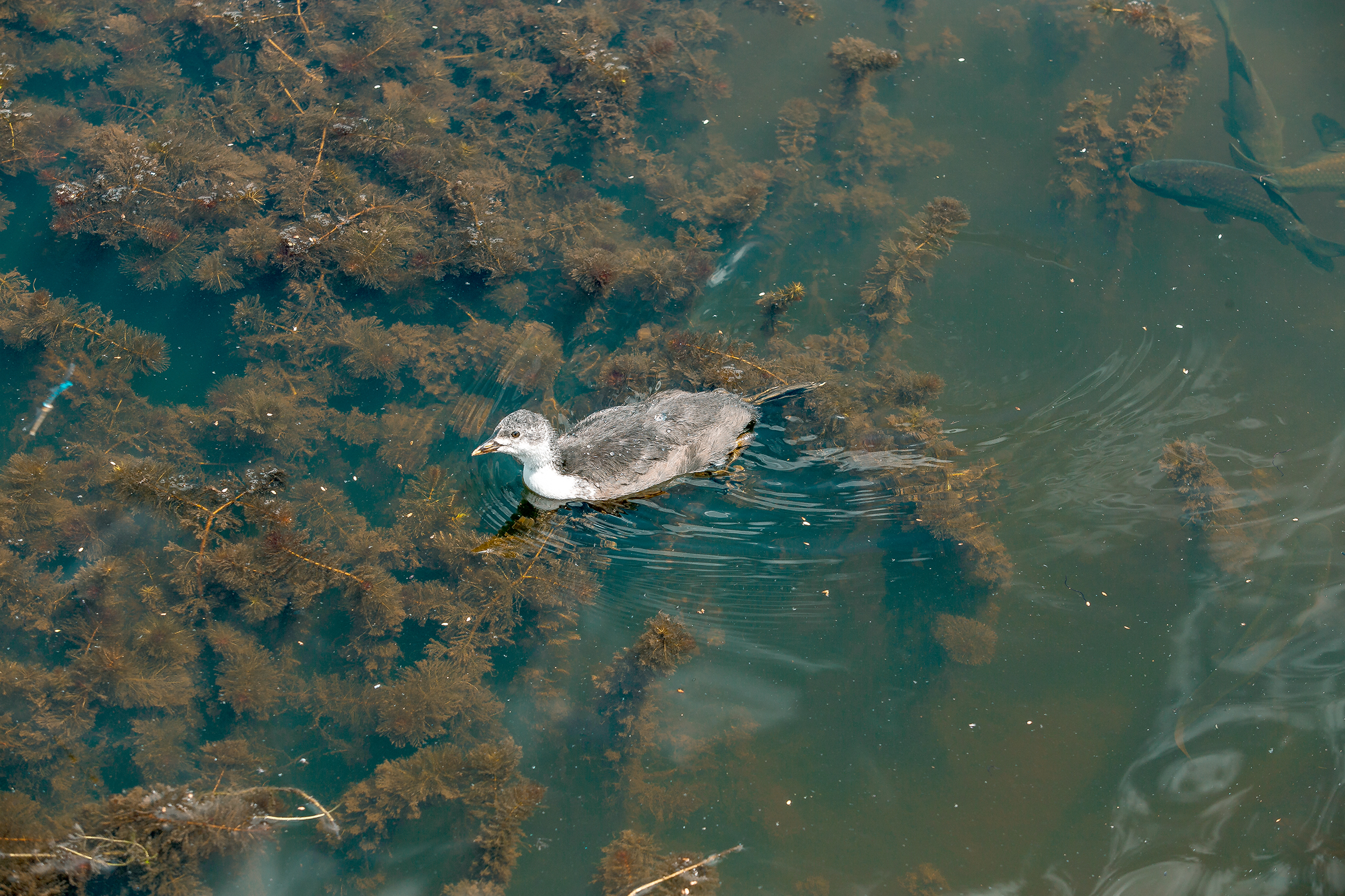 小鸭子嫌鱼儿挡着它们觅食,用嘴去啄路过的鱼。