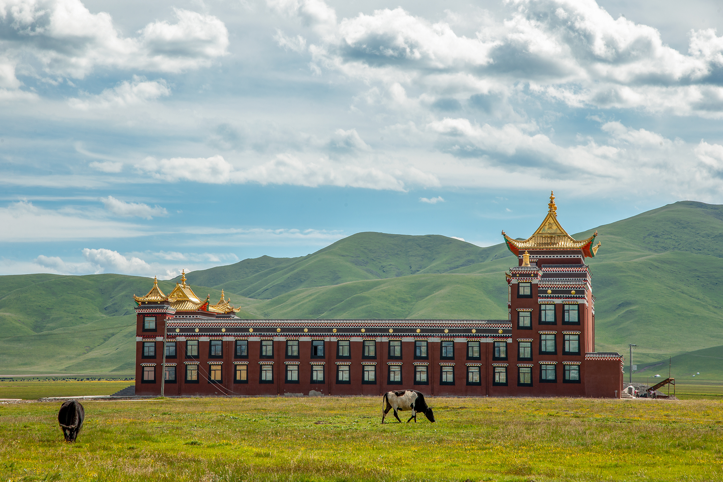 这个地方其实不是我们的景点内容,只是几次经过都有不同的收获,去年走这里,下大雨,雨后马上出现的彩虹,今年再次经过这个地方,只见成群的牛羊在吃草,远处几个红衣喇嘛席地而坐,如画般绮丽,于是赶紧的停车跑过去拍了几张,后来看路牌才知道这个寺院叫阿木去乎寺,这名字很拗口,读了好几次才记住。