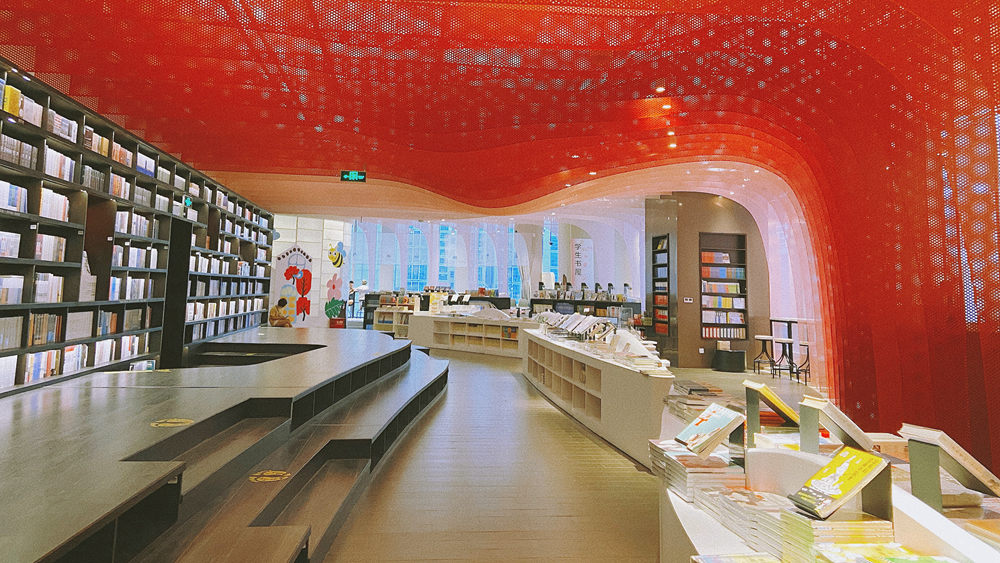 苏州的钟书阁利用书台、书架、台阶等功能,创造出悬崖,山谷,激流,浅滩,岛屿和绿洲。这其实就是一个抽象过的具有中国传统的山水世界——新桃花源,整个书店被广袤的彩虹所笼罩,彩虹从天花泻落在地面形成屏风,划分了不同区域。