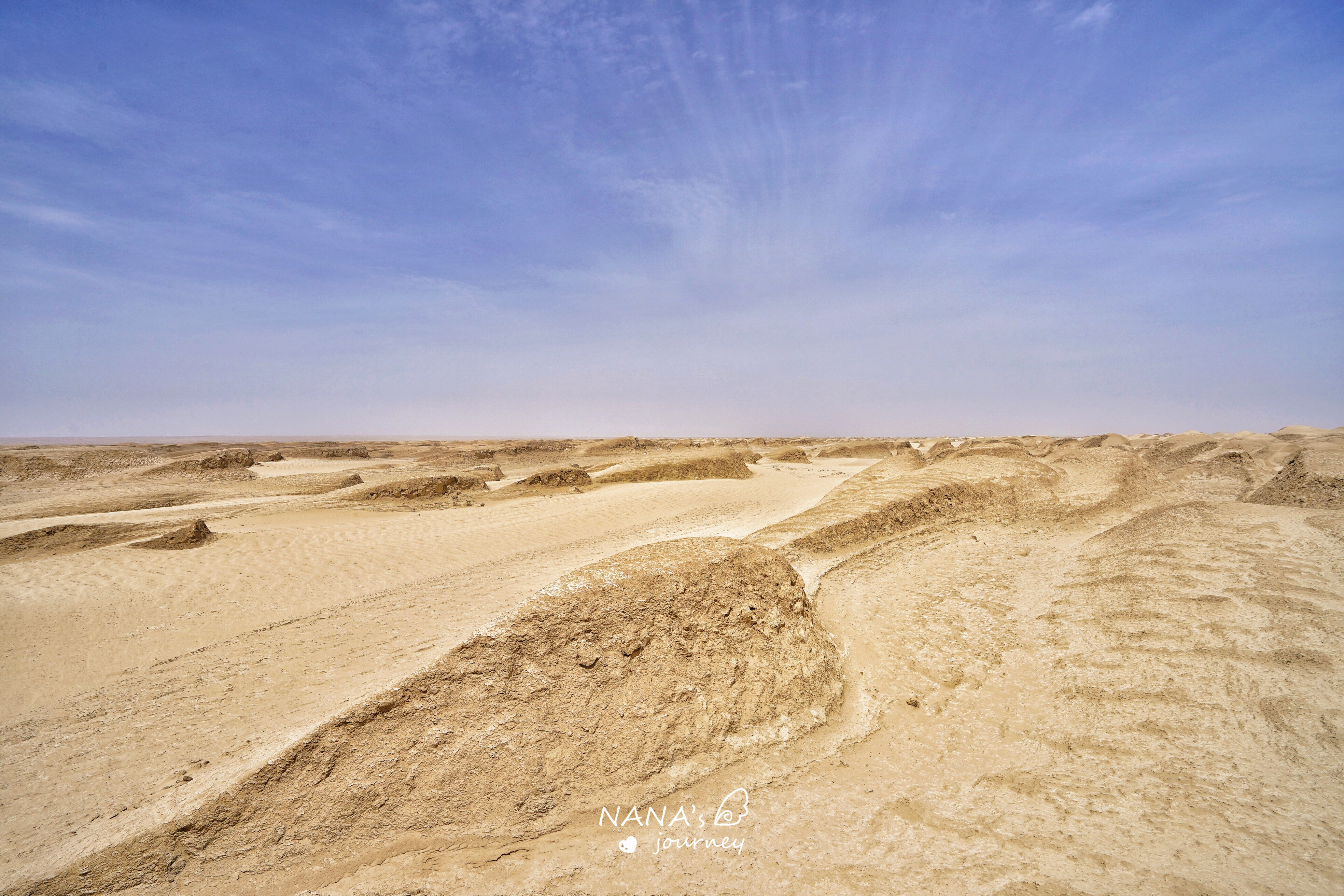 登上雅丹的小坡,全景尽收眼底,路面并不好走,多为松软的砂石,爬坡需小心~