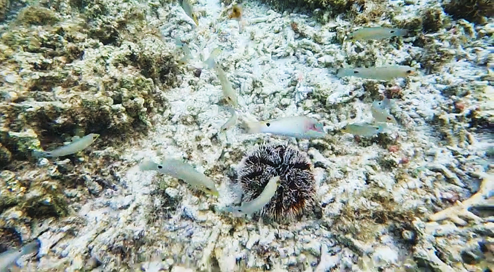 浮潜的地方有一种长刺海胆,不能吃的,藻食性,昼伏夜出,刺长,有毒。玩的时候要注意一下,被扎了很麻烦的。浮潜的时候,不认识的生物不能碰的。