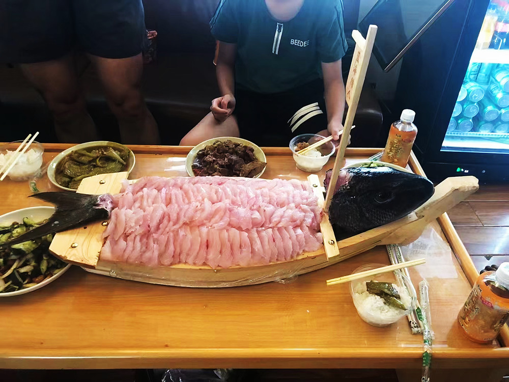 午餐,最大的亮点就是这一条海底飞龙的刺身,这条鱼活着的时候,有二十斤。鱼头大家都说可以在煮个汤