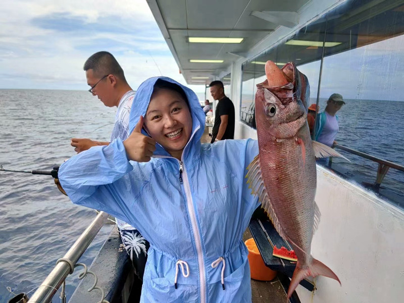 钓鱼开始,杆一放下去,就有鱼咬饵了,周围的人都在猜测是不是有鱼。收获一条歌利。我收鱼的时候,旁边的两个杆也上鱼了,右边的杆上,两条鱼,浮出水面的时候,上面那条鱼掉了,好可惜啊。鱼竿放下,感觉又有鱼了,收竿,运气真好,也是两条鱼,一大一小,目前钓的鱼都是一个品种。大家都在问这种鱼都陆地上能买多少钱,船员告诉我们,这种鱼没得卖。下竿又有鱼了,这次的鱼不一样,让船员过来取钩,领队在旁边说,可以放血排酸。瞬间明白,刺身有了。旁边有队员跟家里人说要带100斤鱼回去,可以吃半年。新手也是收货了几十斤鱼,还是不错的哦!