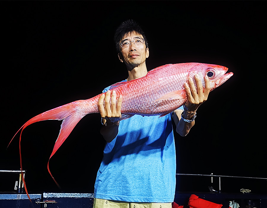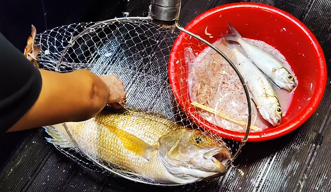 上钩一条黄色的鱼,拉上来都在问船员这是什么鱼,黄金歌利,唉,就是一个歌利鱼。两种歌利在一起,还是蛮有对比度的。