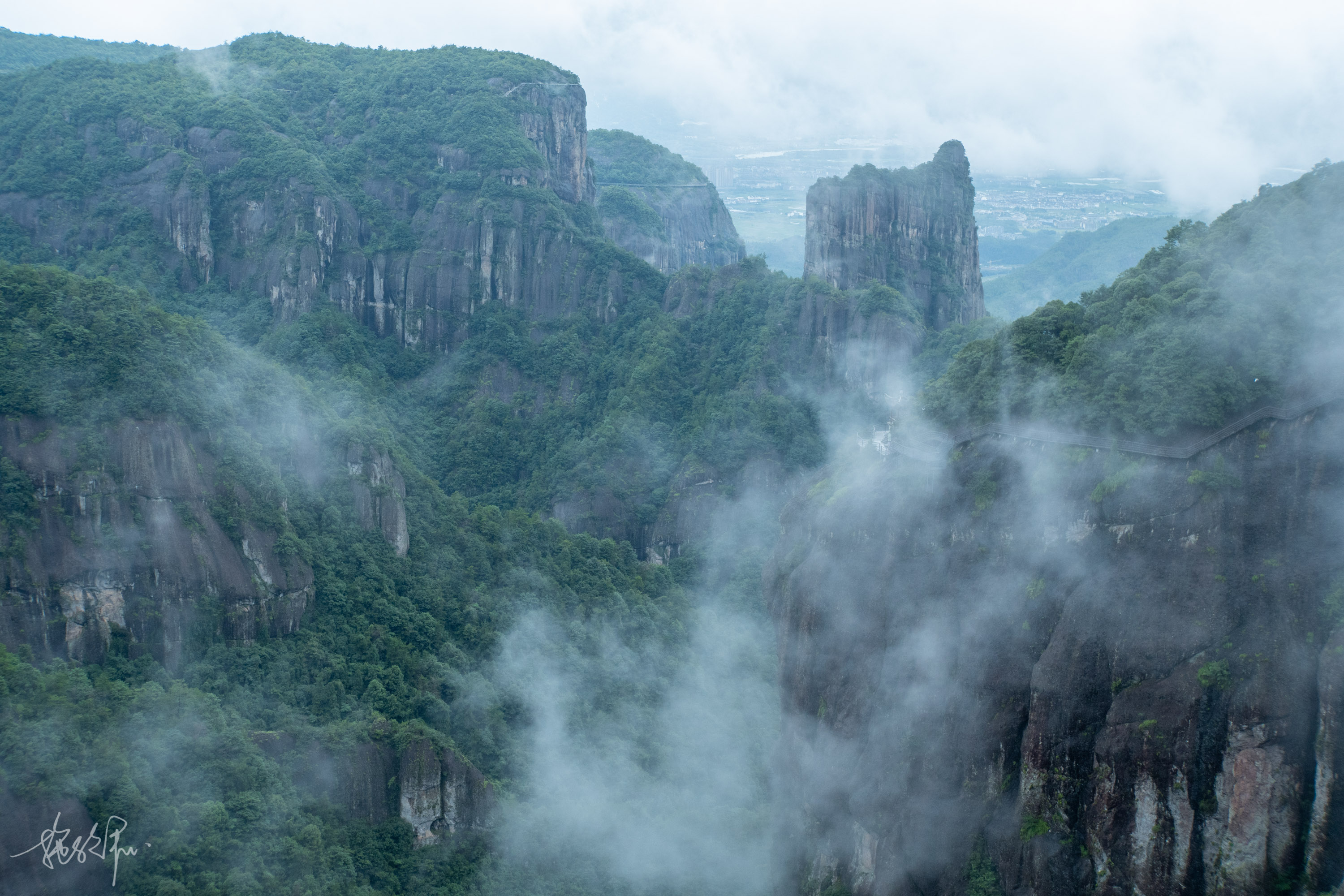 山顶上有一圈观光栈道,有的人也许绕着走时都会有点恐高,毕竟就是身处在最高处看着这片迷人的山脉,谷底临海莽莽,我们在褶皱的悬崖山间前行着。