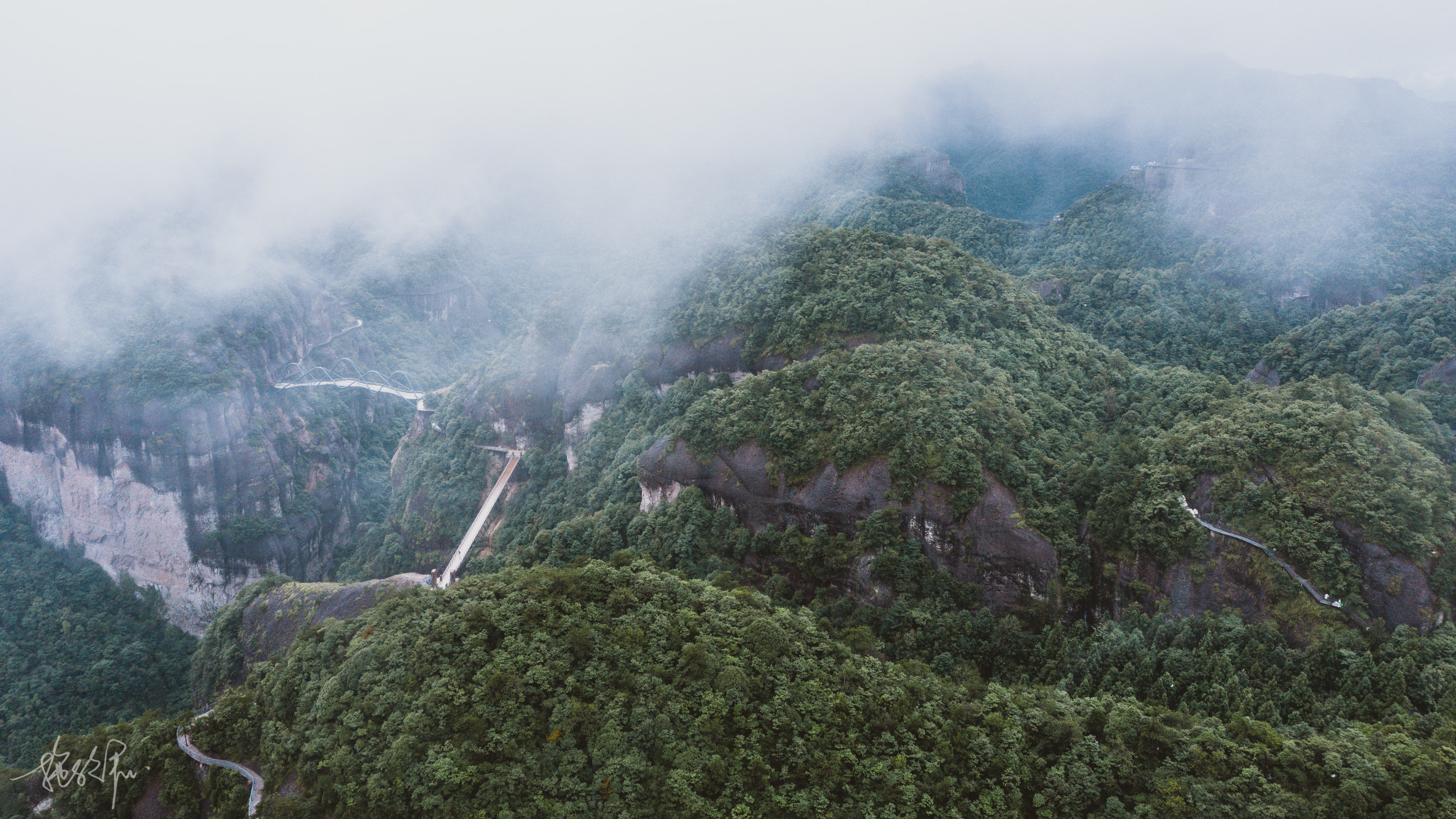 只见山间腾空而起的云雾缭绕,偶尔一阵风吹过,时不时地浮现出如意桥、特色的房子和险峻的山峰,只是一瞬间,可能又躲进了云雾里,绝美的景象又消失不见,无人机飞过这片雾气,山顶上那层层叠叠的绿色就又显现出来,实在是美不胜收。