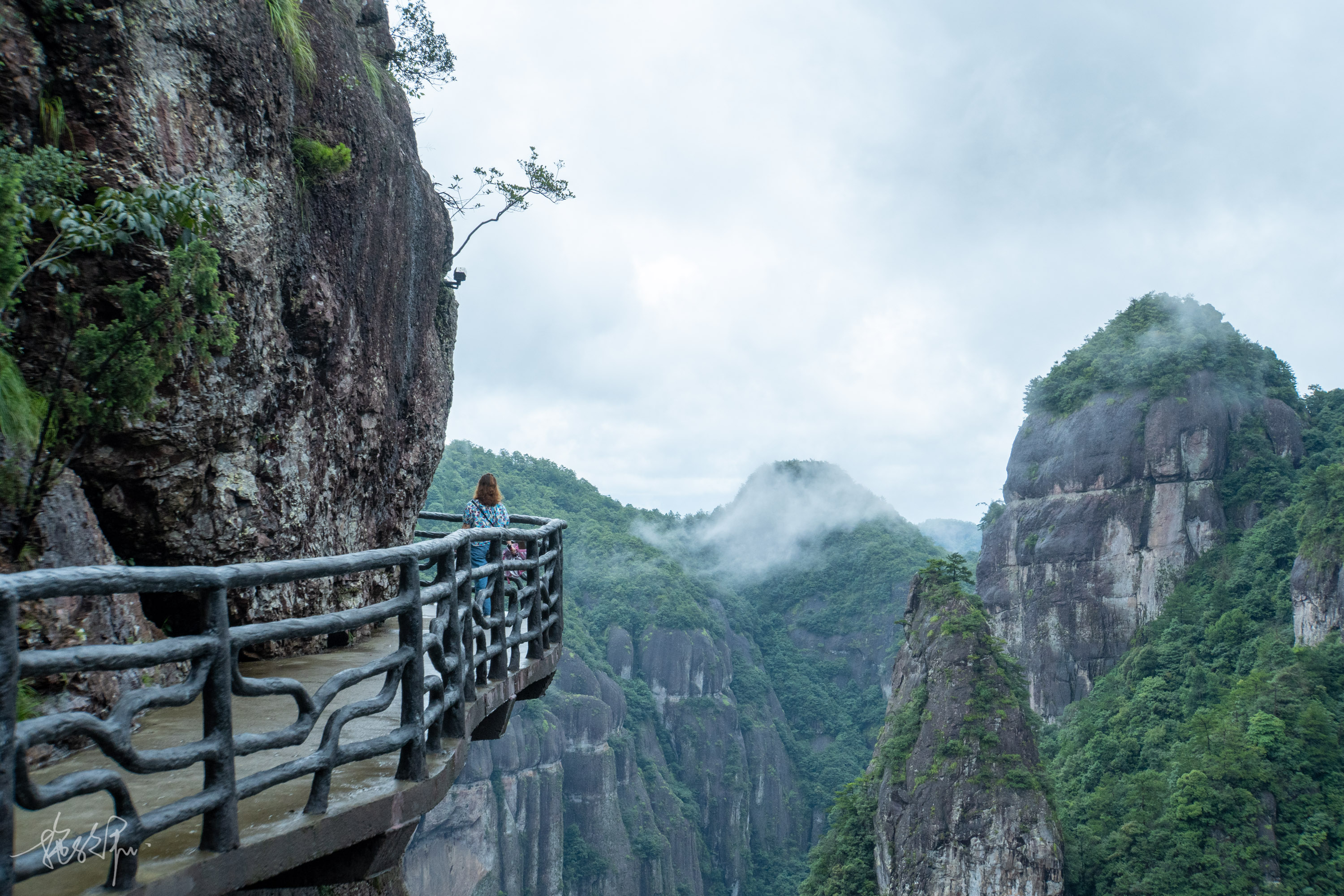 我们的第一站来到了问仙桥,一座小巧的石拱桥,桥下流水潺潺,抬头望去是仙境般的神仙居火山流纹岩地貌,天淅沥沥下着小雨,地板都湿透了,远处的山就像进入仙境一般。