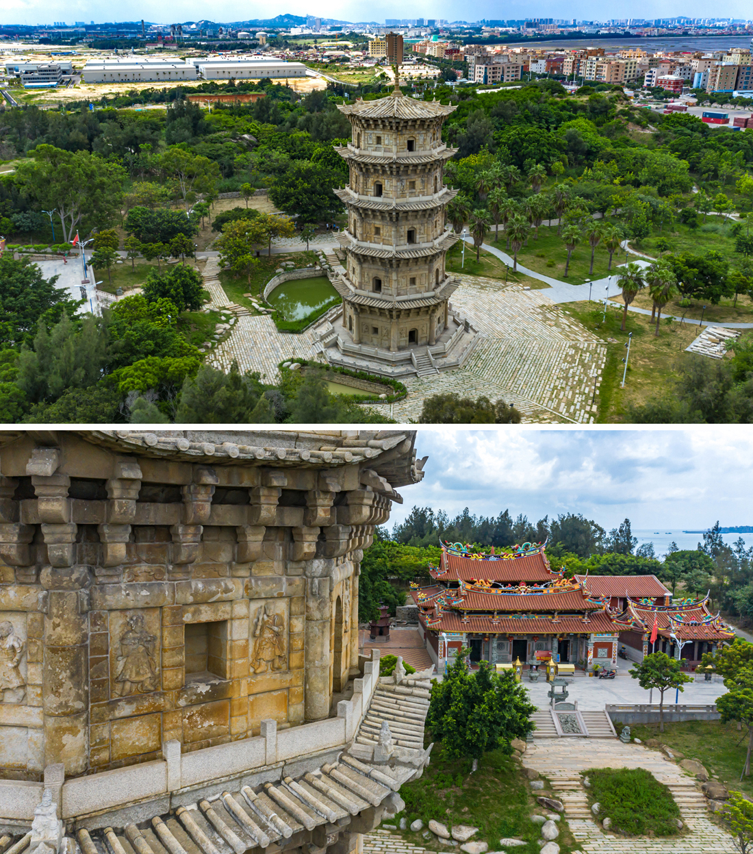 其中一座万寿塔又名关锁塔、姑嫂塔,建于南宋绍兴年间(1131-1162年),相传是为了纪念一对情深义重的姑嫂而建。塔高21.65米,八角五层,为仿楼阁式花岗石空心石塔。通塔不事雕饰,古朴粗犷,布局奇巧,是船舶进出泉州港重要的海上航标。