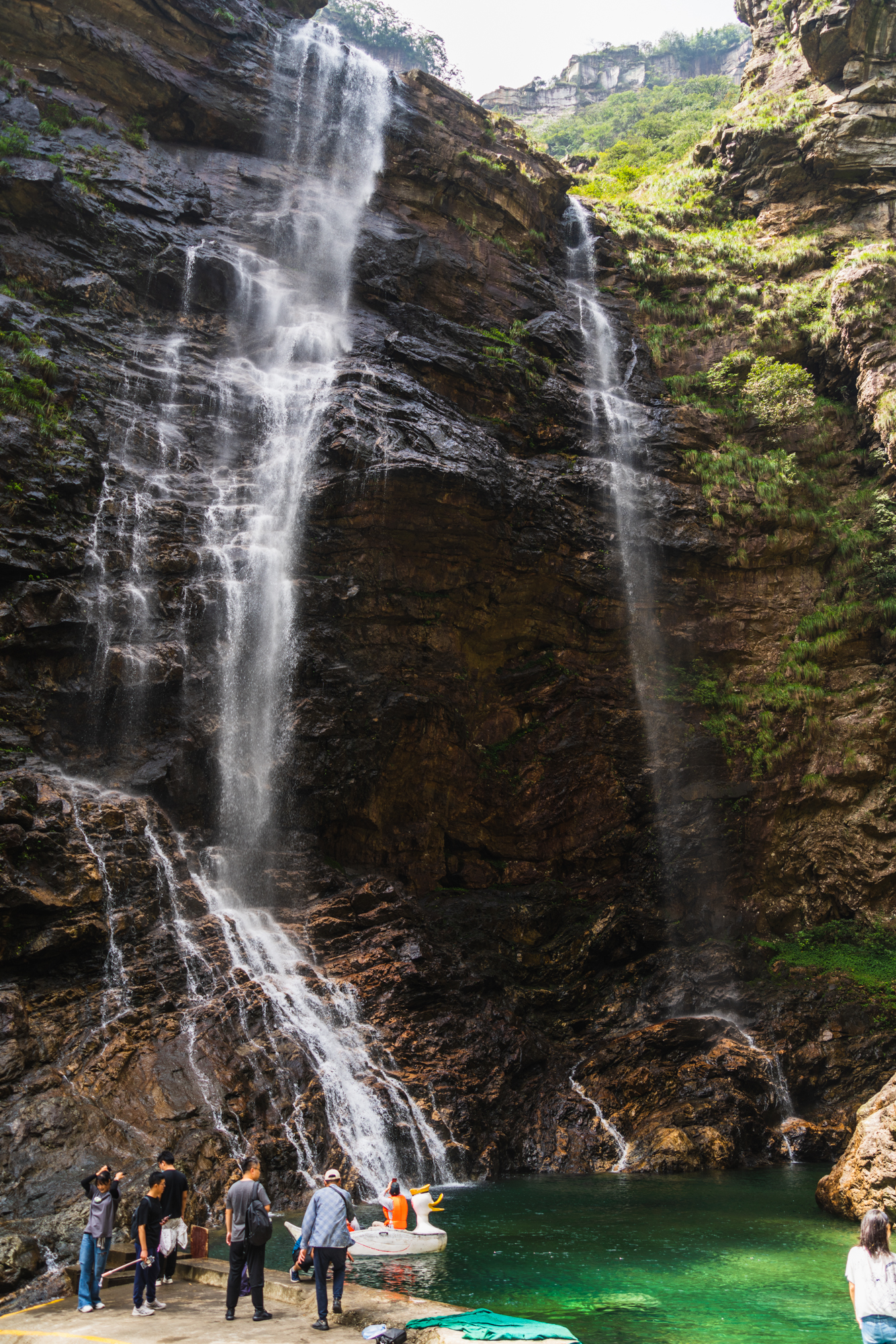 瀑布三叠,一叠一重奏。三叠泉的最佳观赏点在三叠的位置。站在观景台处遥望,瀑布一叠一叠从高山上奔流而下,在阳光下,丝丝缕缕散发光芒、熠熠生辉,犹如为庐山佩戴了一条闪闪发光的银项链。三叠瀑布在山腰处汇聚成一波清潭,是项链上挂着的宝石。潭水清澈见底,可以行船,亦能带来好运。