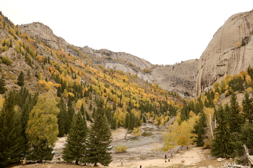 额尔齐斯大峡谷是额尔齐斯河的源头地带,全长70多公里。沿途的花岗岩山峰表面,有着密集蜂窝状的凹坑以及好似凝固的巨瀑一样的竖直沟槽。