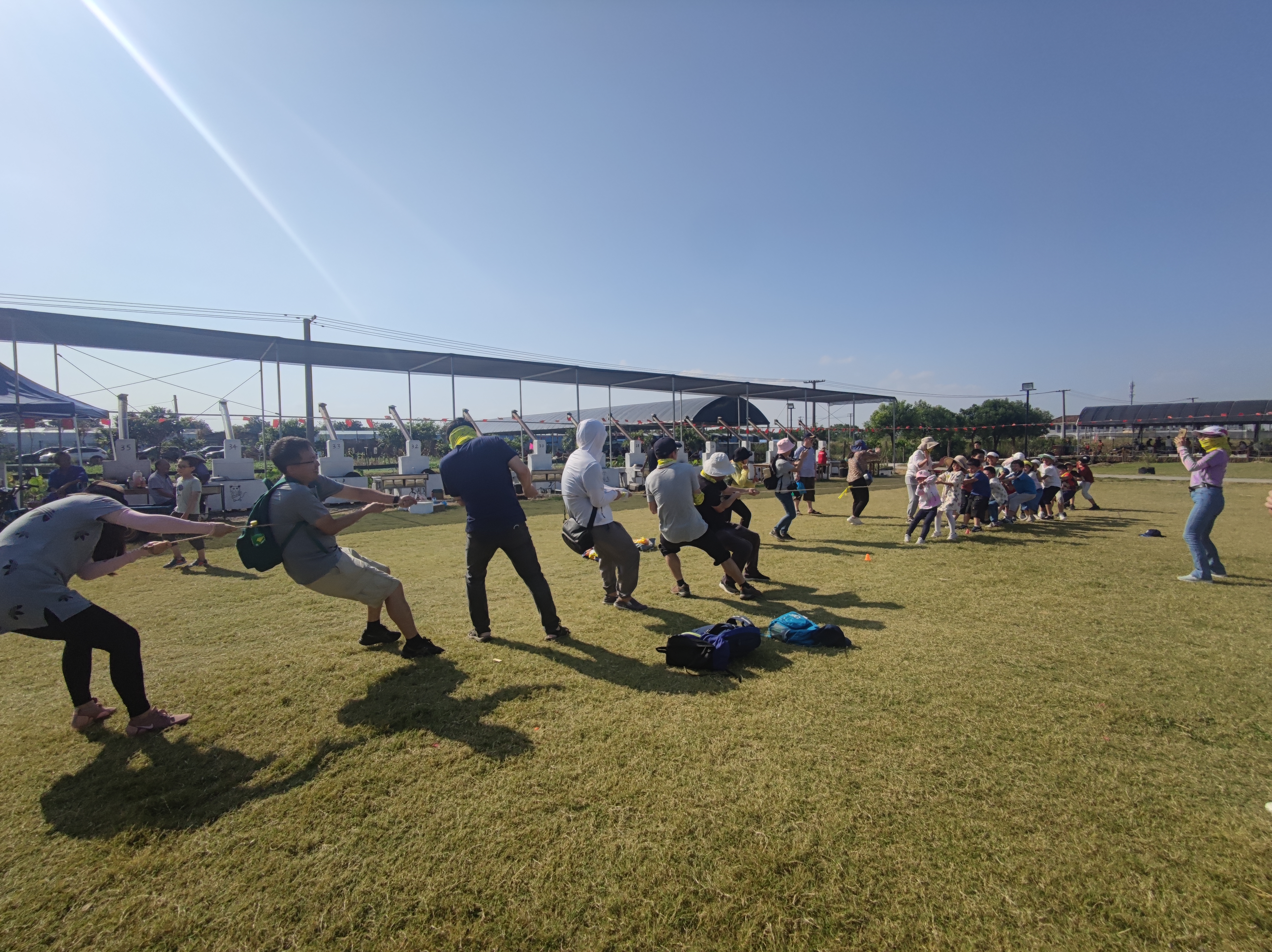 饭后小憩,就开始了今天的亲子游戏环节。大大的草坪,快乐的童年,虽然烈日当空,也阻挡不住小朋友兴奋的心情。我们先后开始了趣味拔河,袋鼠跳,看谁站得稳等几个有趣的小游戏,看的出来,小朋友们运动能力真的太强了。