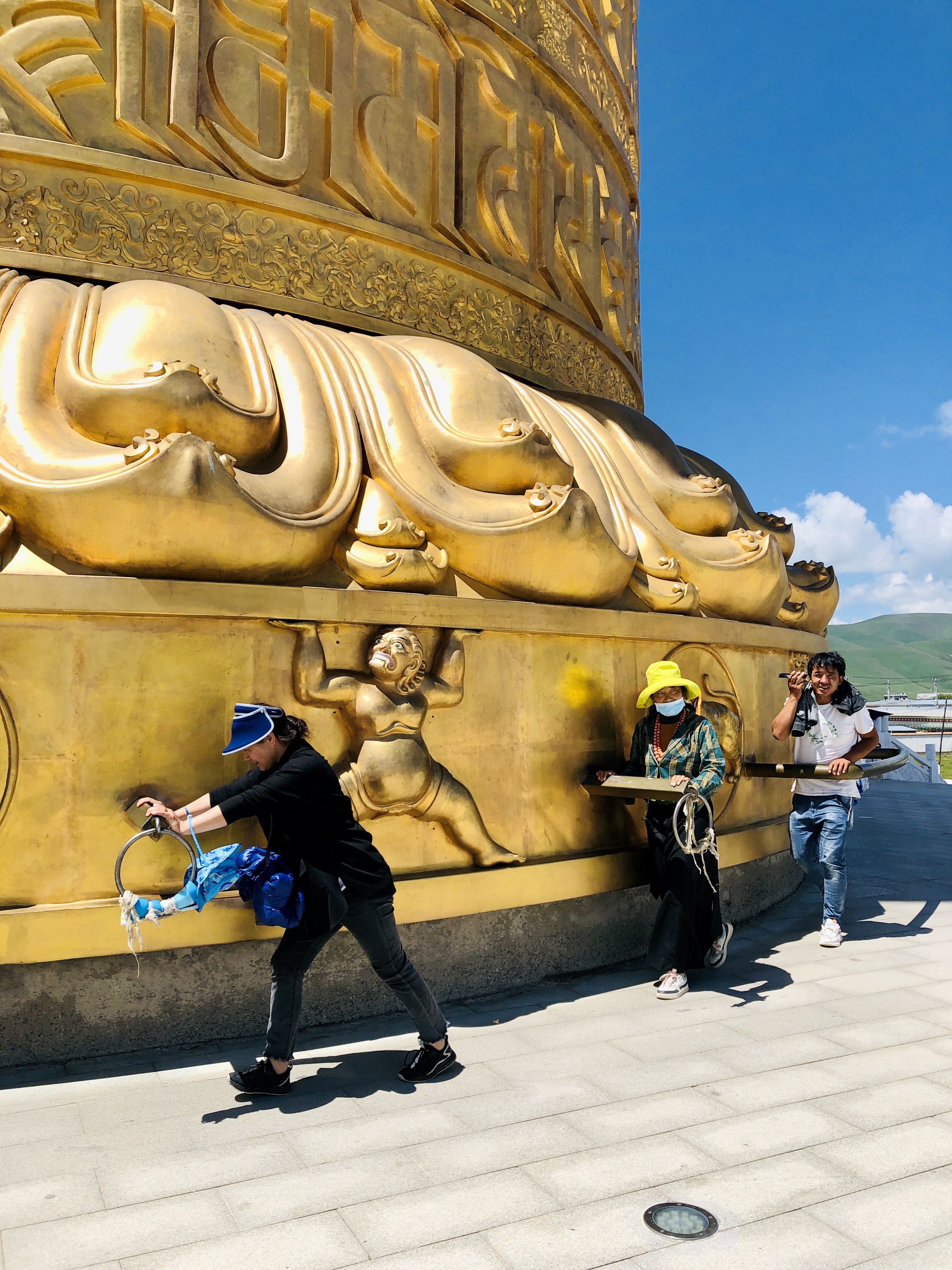蓝天白云之下,巨大金色的转经筒缓缓转着,僧侣,藏民还有游人在艳阳下推着,不时有人加入,不时也有人离开,有孩子坐在推把上,有人边推边看手机,还有人一手摇着转经筒,一手推着转经筒。转经筒广场前的草地上有各种车辆,搭起了许多帐篷,看起来像是有什么活动,我过去打听了一下,原来明天有活佛讲经,这应该是个临时集市。