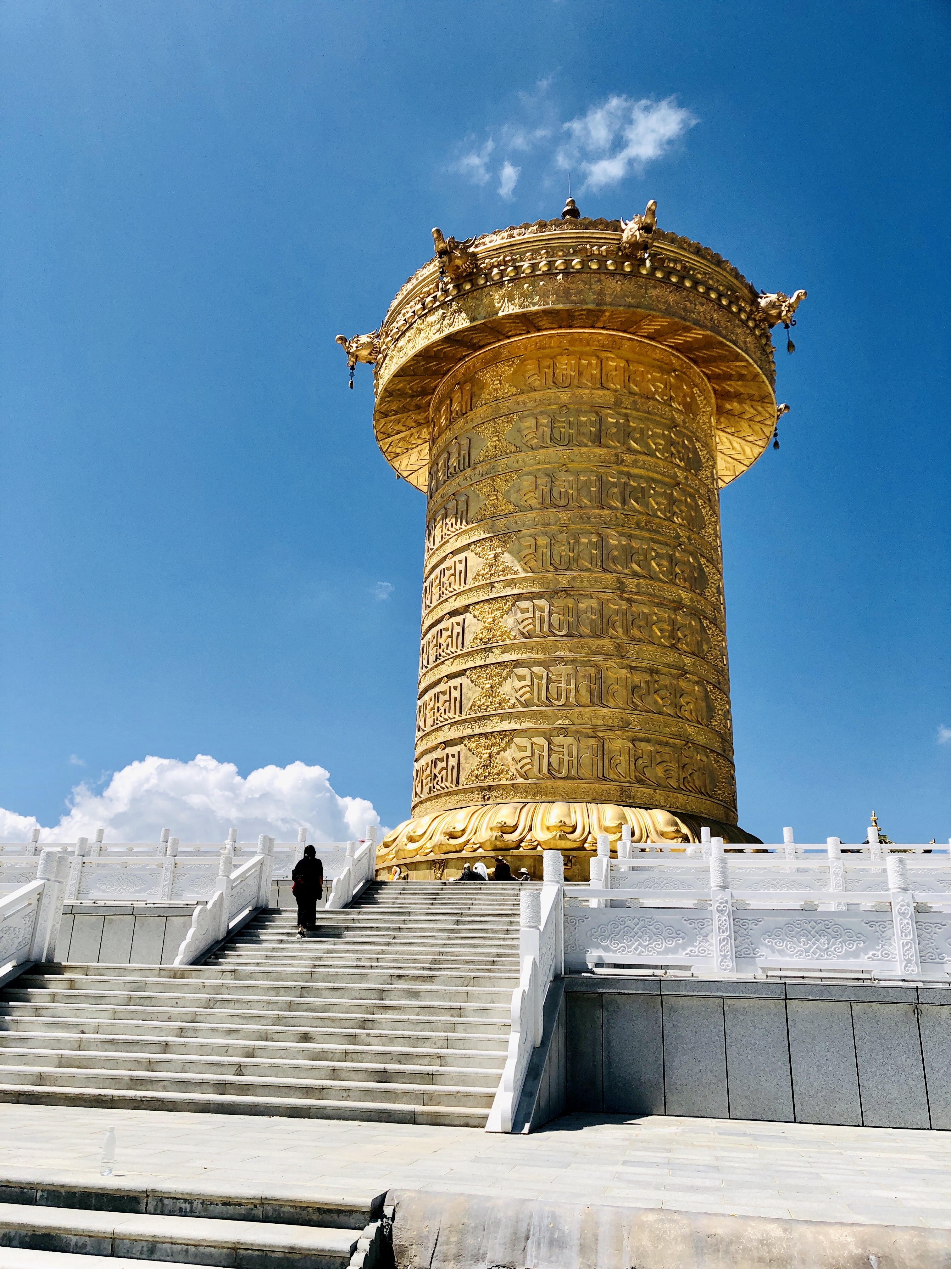 藏传佛教有一个重要标志,就是转经筒,各个寺院都有供人推转的大小不一,材质不一,花纹不一的转经筒。转经筒小到人手摇的,大到世界最大,吉尼斯世界纪录保持者,阿万仓娘玛寺转经筒,转经筒总高度37.73米,下筒直径12.6米,旋转经轮总重量达320吨,令人震撼。