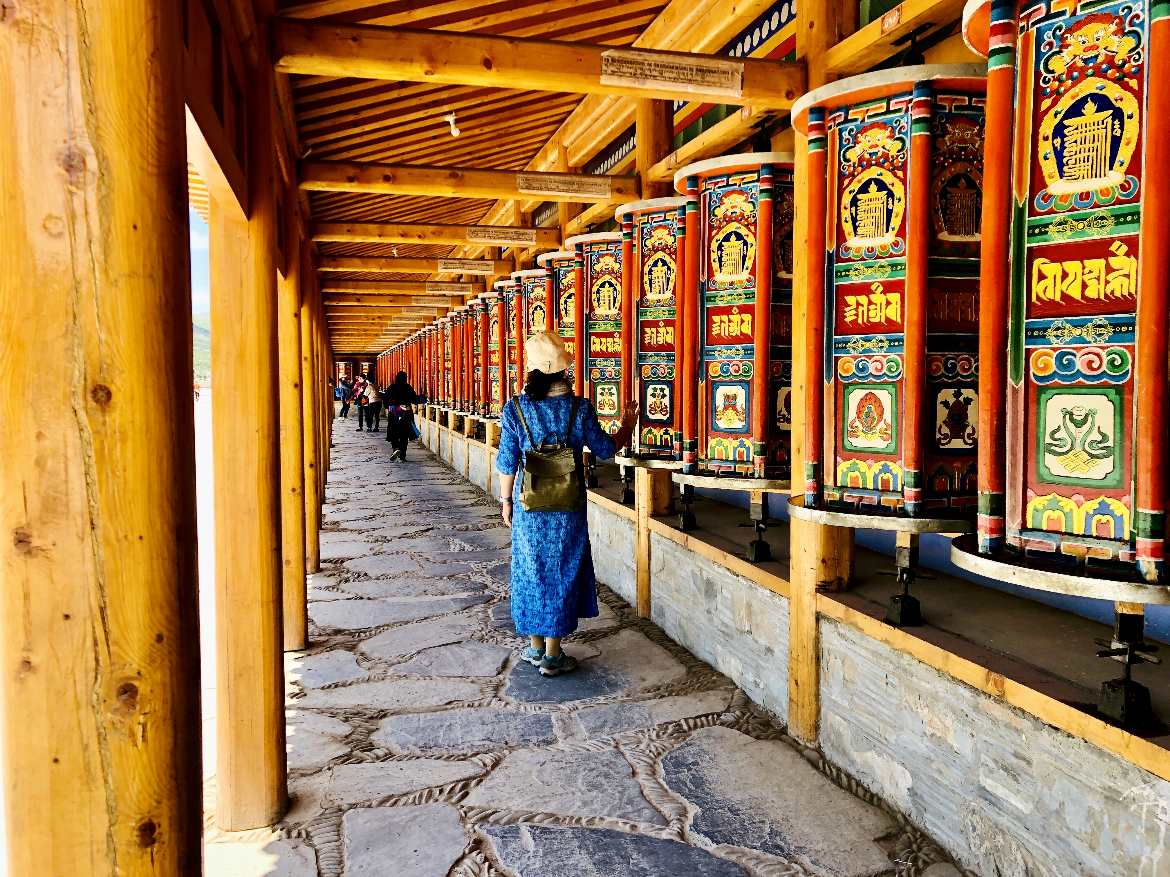 拉卜楞寺有世界最长的转经长廊,共有大大小小2000余个转经筒,转遍每个转经筒至少需一个小时以上,走过路过的藏民默默地拨动转经筒,一个又一个,虔诚已经融化在他们的心中,祈望带来平安和圆满。