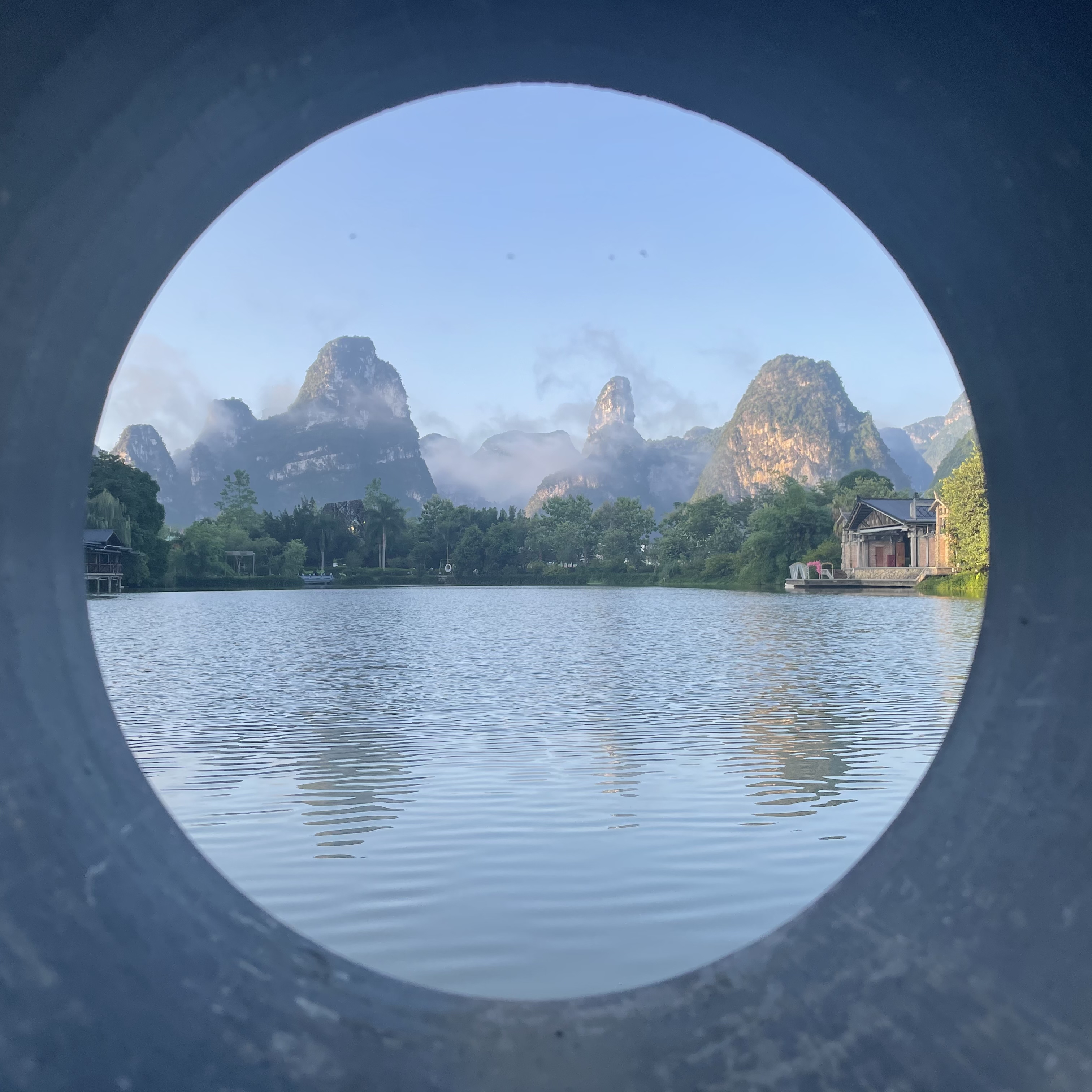 由于前一天的降雨,早上的明仕只能用仙气飘飘来形容,喀斯特的山峰搭配云雾,绝了。这张是在桥上找了个护栏的桥洞拍摄的,打开手机的超广角即可。
