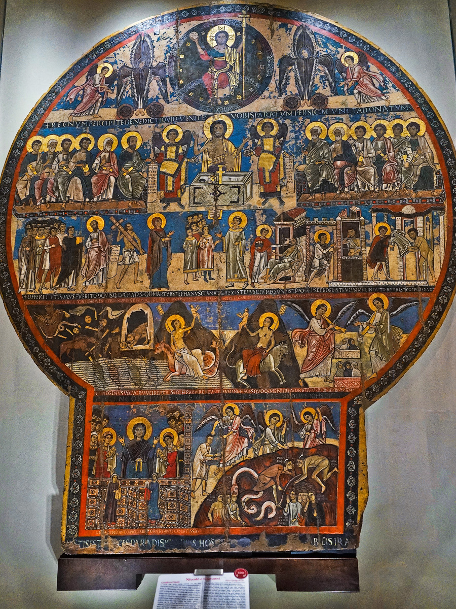 画面可分四个阶层,最上层是天国的无翼天使,画面中央是神态威严的救世主基督耶稣基督,耶稣十二宗徒和圣母玛丽亚环绕在旁边。画面下部是善恶两类人正受到重生的耶稣的裁决。最底层是地狱。