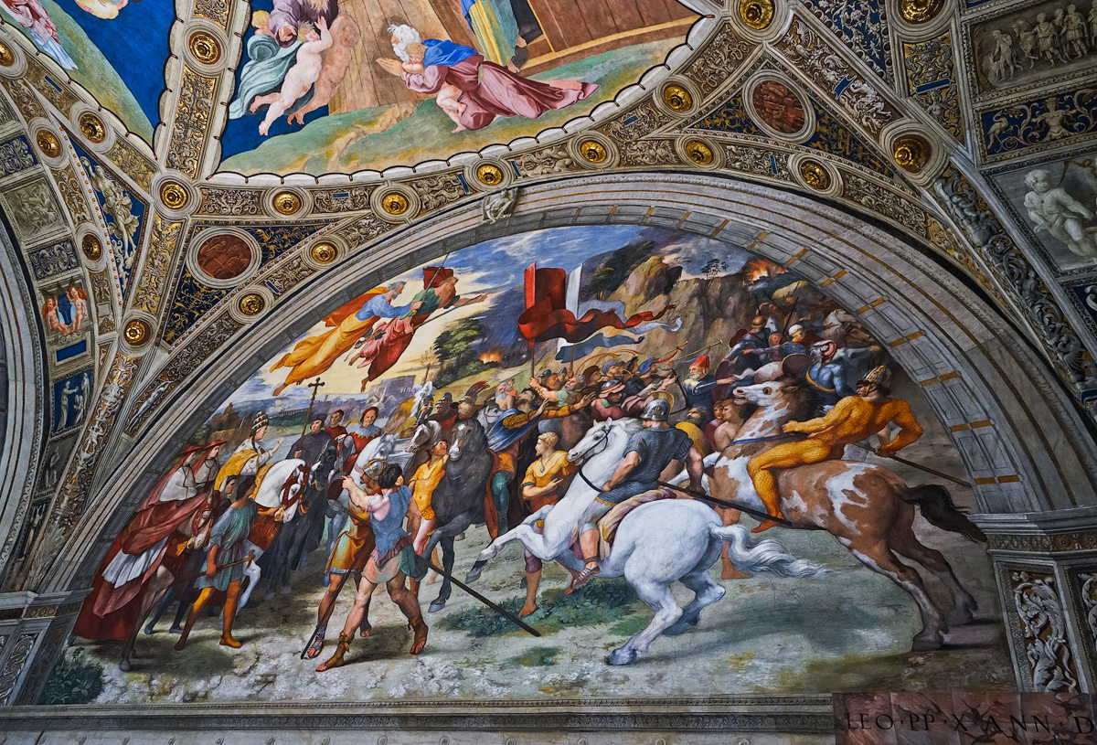 拉斐尔的名画《圣礼之争》。画家在半圆形的画框内用云层作横带,形成天上和地面的区别。拉斐尔透过不同时间中人物的汇集,表达在历史中、在各种贤者的参与中汇集而出的智能,它们包括研究圣经、思想、祷告、信仰实践与争辩的整个历史过程。