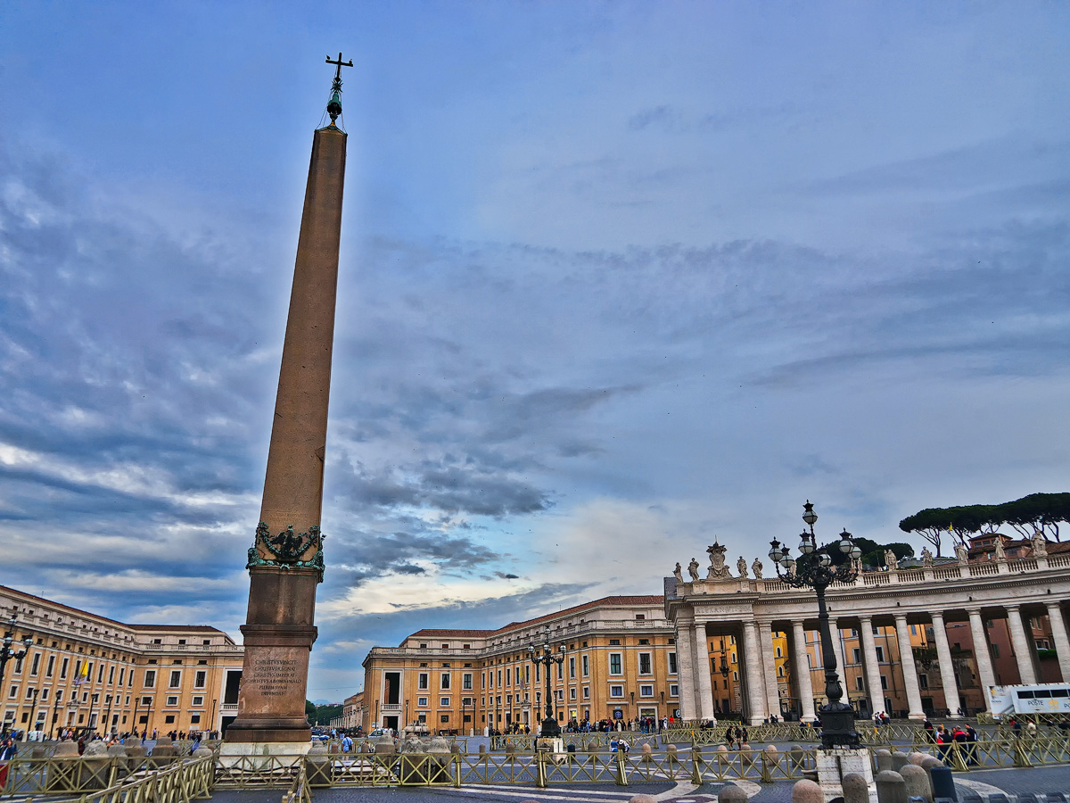古老的 埃及 方尖碑,见证了古 埃及 和古 罗马 基督教徒的苦难。据说公元64年,耶稣首徒 圣彼得 就在这个广场,被反基督的 罗马 皇帝尼禄倒钉十字架而殉教。如今,每逢星期日中午12时,聚集在广场上的人们,聆听站在皇宫窗口的教皇发表晨祷词。