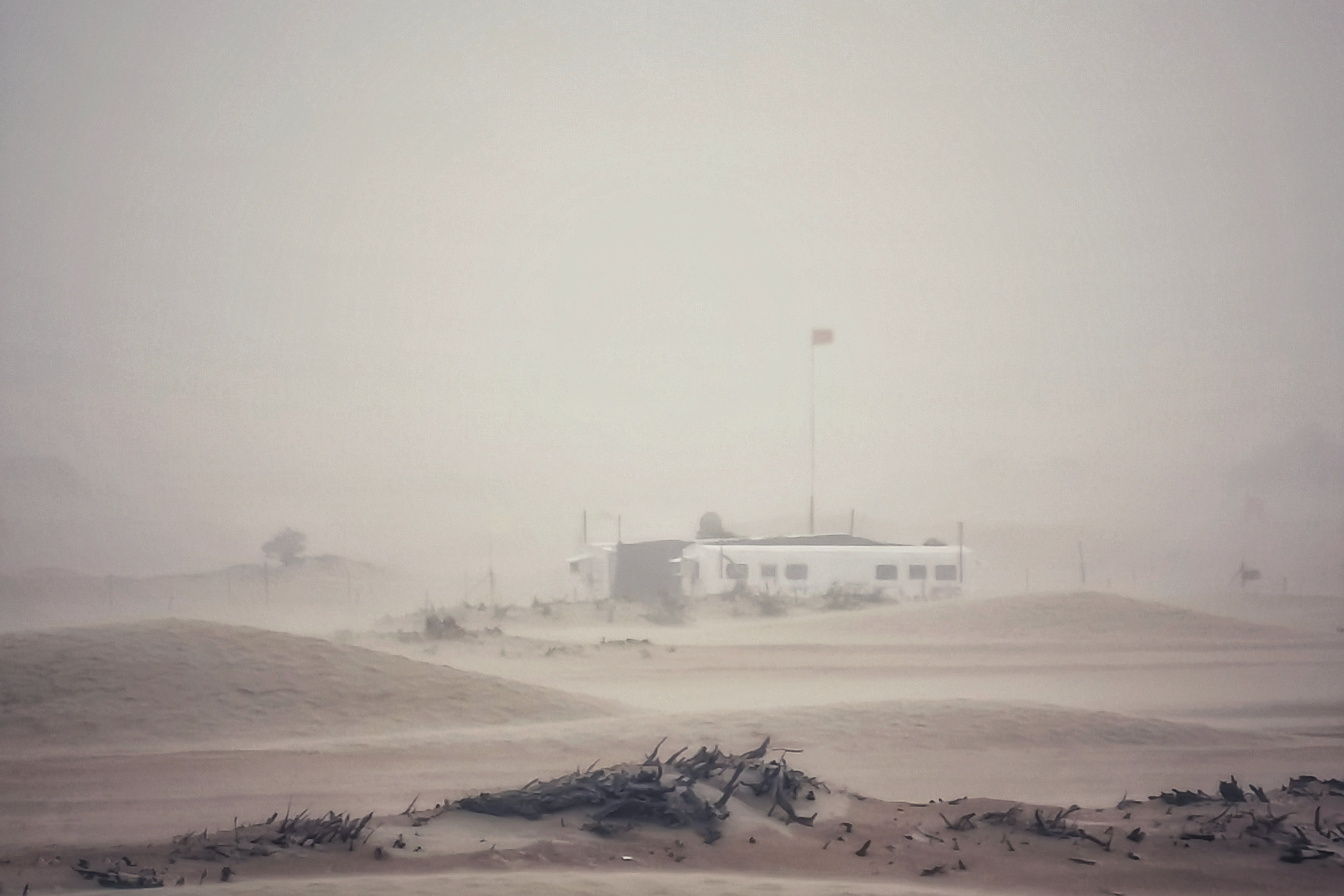 出发的比较晚,再加上路上两次爆胎。我们不得不在沿途找了一处挡风的地方扎营。两台皮卡保障车,带着我们的物资和食物,为我们支起了充气大帐和露营帐,不到1小时,就在黑夜前为我们提供了温暖的港湾。