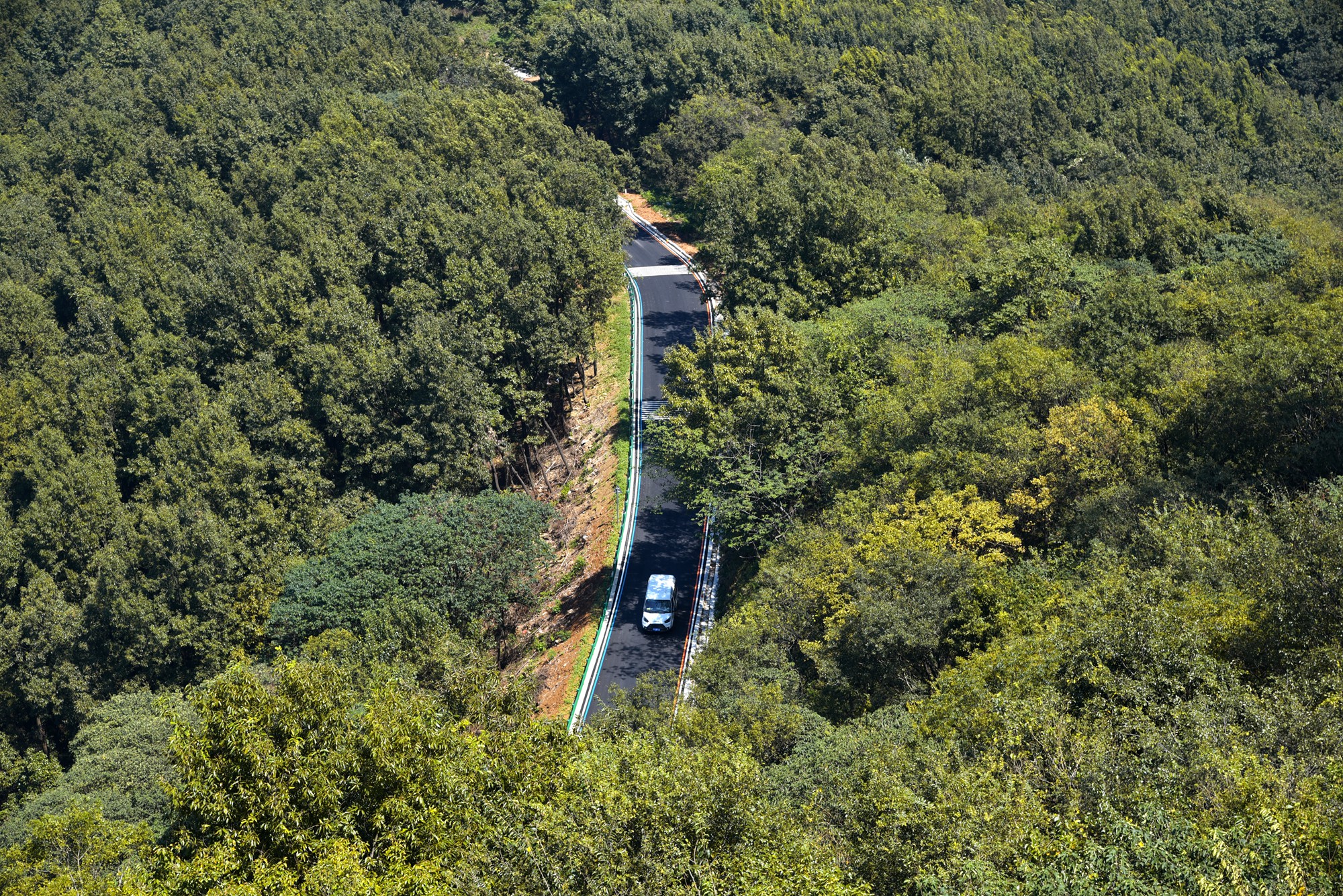 告别皖东银杏王,继续自驾来安之旅。为了打造江淮分水岭自驾线路,在路中央刷上了三种色彩的分割线,每两县交界和自驾线入口设立了标牌,还在路边建造了观景台,让自驾的游客短暂休息的同时还能更安全方便地看看路上的风景。在来安岭上观景台,我们停下车,太阳渐渐降低了,在山林田陌间洒下暖色的光,观景台上乡愁的图案和字样十分应景,勾起了路过游客的乡野情怀,想去当地的村子里走一走,看一看。