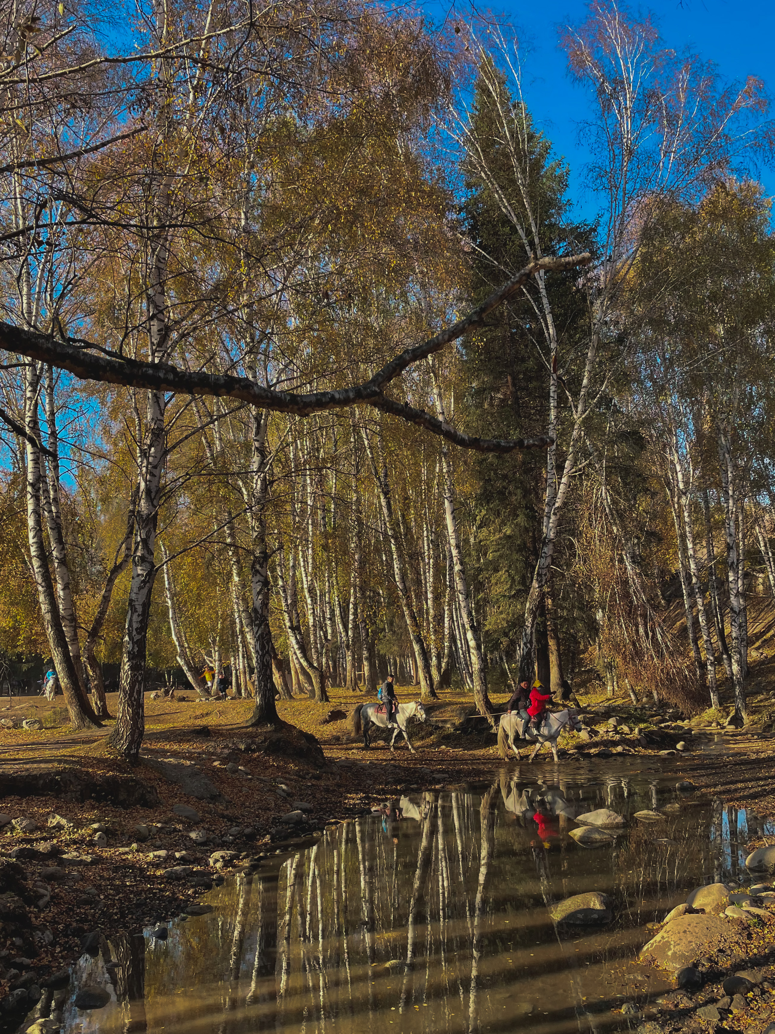 请忘掉那个因为下雪而变得灰蒙蒙的禾木吧,阳光照耀下的禾木,就像是给黑白照片添上颜色一样,这样的禾木,才是它真正的样子。看完晨曦从平台下来走进村子里,生活气息扑面而来,因为早餐店营业了。平台上的寒意被这一个个早餐店驱散,引得一众游客前往光顾。后来,被阳光吸引去了白桦林里,却无法沿着禾木河走一遍,遗憾没有在这里多停留些时间。最后只能在这美好的日光下,依依不舍地离开了这个宝藏小村落。