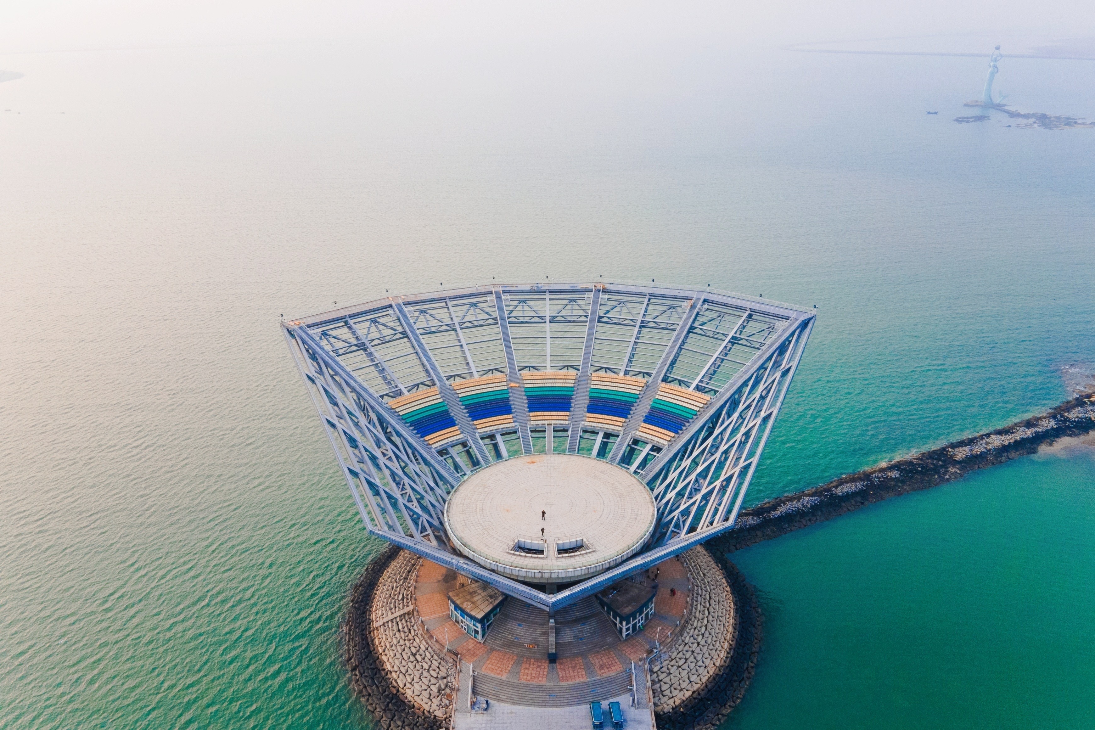 渤海明珠观景台是一座造型的庞大建筑,这座建筑历时17个月、耗资9000万建成,整体高40米,最大悬臂长65米,宛若一只巨大的贝壳,其独特的造型为国内之最,且是世界上最大的海上建筑,享有“海上贝壳”的美誉。