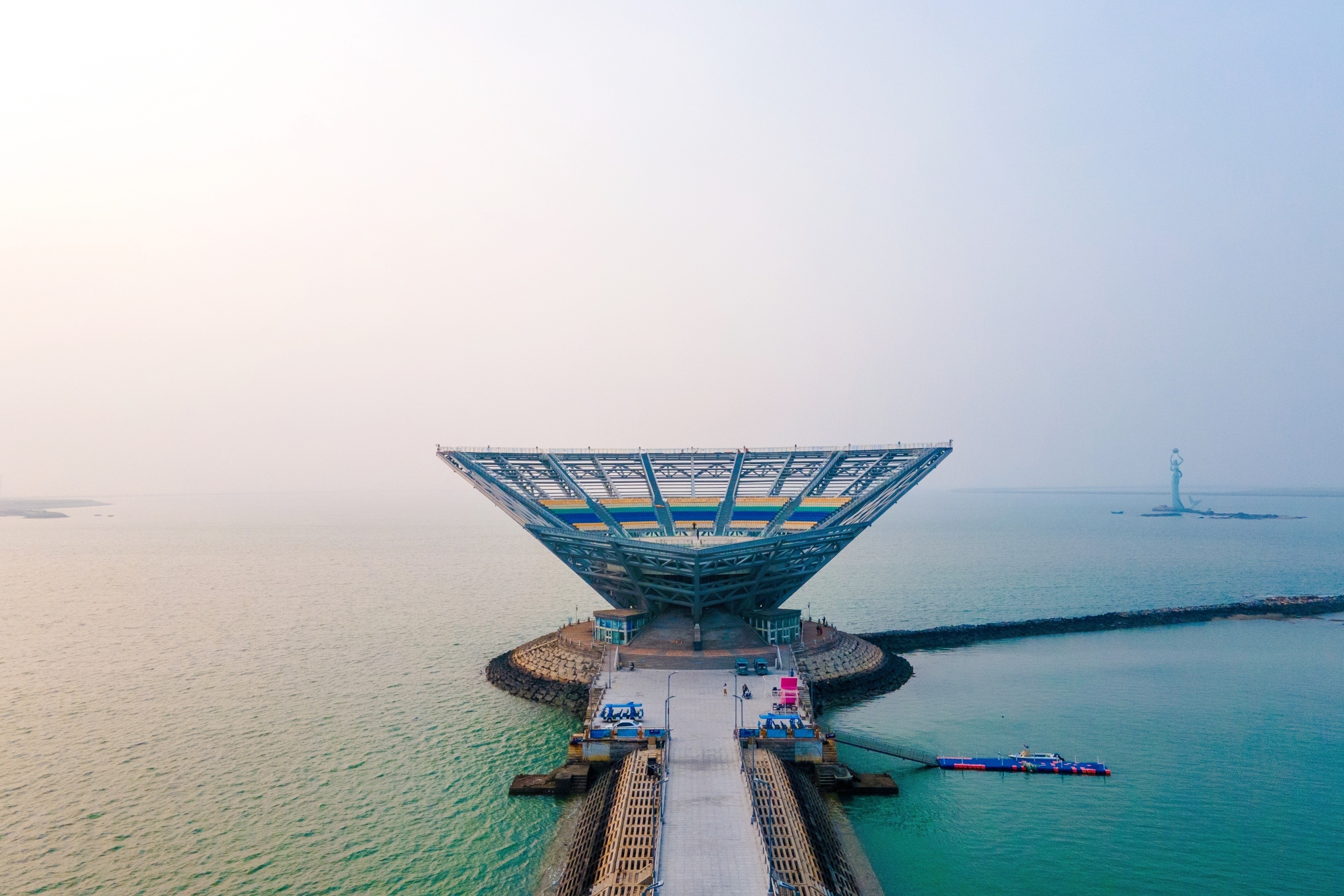 若要去往渤海明珠观景台需要通过一段栈桥,栈桥宽8米、总长668米,宛若一条跨海大桥屹立在蔚蓝的大海之上,建议步行游览参观,若是体力不支,也可以选择乘坐景区观光车,可以直达渤海明珠观景台下。