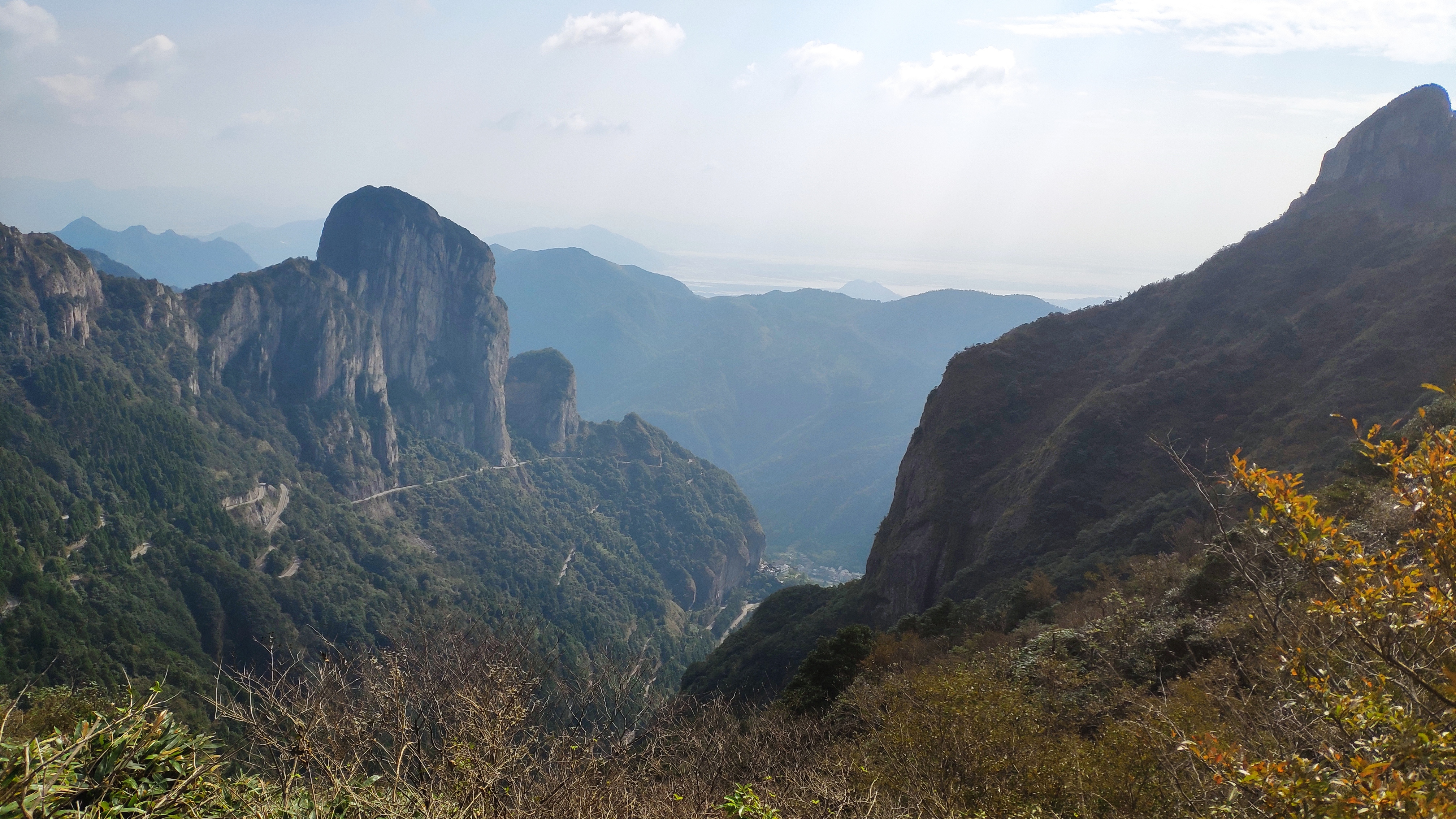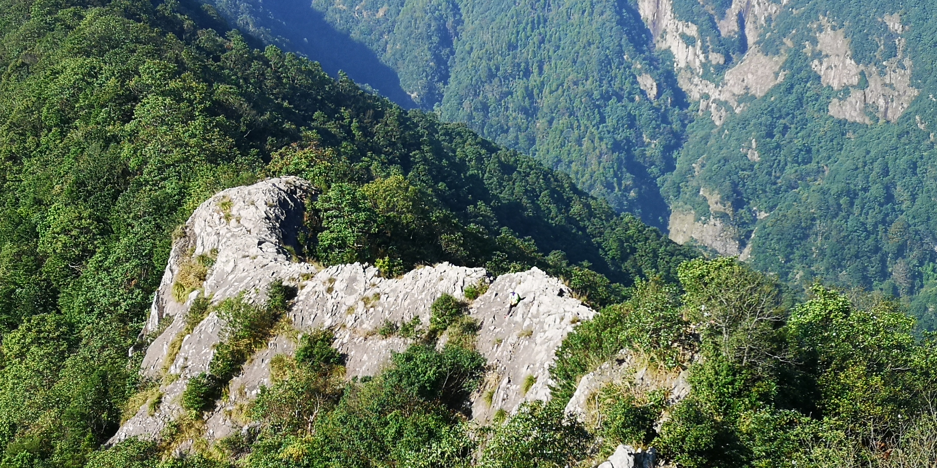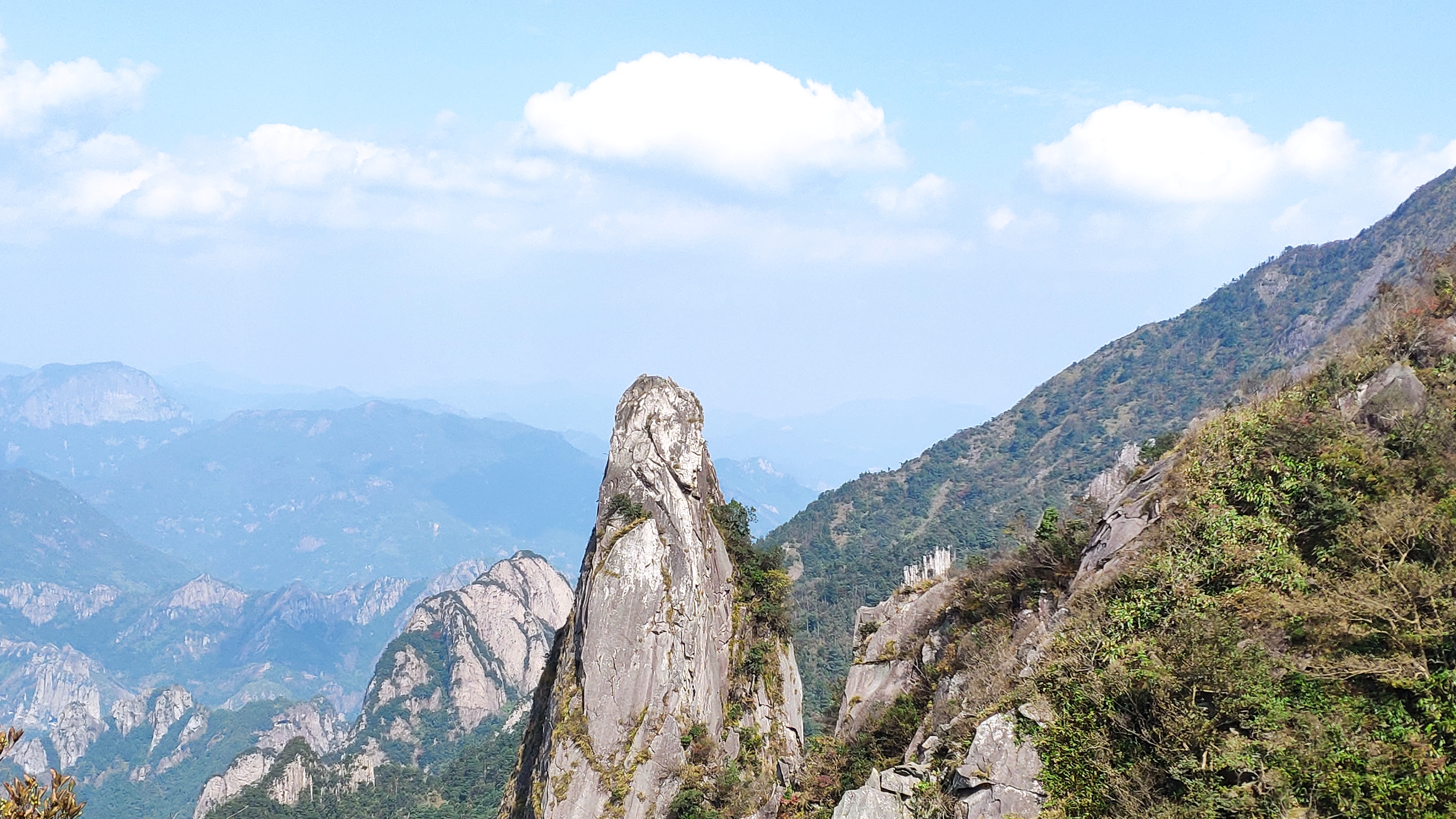 大约8:30时,行走了7.5km的我们,来到了一个小山尖下。这个小山尖,并不在我们原定的行程之上。但据前方的一位大哥说,小山尖上景色很棒。于是,面条、军军大哥、我,本着“来都来了”的态度,决定加下鸡腿。然而,攀爬这个小山尖,并不轻松,尤其是一小段垂直的山岩,让我打起了退堂鼓。不过呢,登山,本就是在一面向往、一面恐惧之下的平衡,小山尖如斯,雁荡四尖亦如斯。这时,面条在前方开路,并给了我很大的鼓励与指导,帮助我克服心中的恐惧,我才能够和他们一起一览小山尖之上的无限风光。