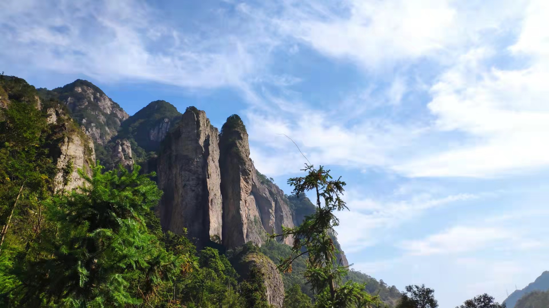 视野之中最具冲击力的,便是右侧的山峰与岩壁。陡峭而险峻,直入云霄。险峰重重叠叠,有的像被刀刻过一样笔直挺立、有的被群峰紧紧拥簇、有的像并排横列的竹笋、有的又好像挺拔的灵芝仙草、有的像直立的笔杆,有的像斜拉的头巾。(“两壁峭立亘天,危峰乱叠,如削如攒,如骈笋,如挺芝,如笔之卓,如幞之欹”,摘自《徐霞客游记·游雁宕山日记》)